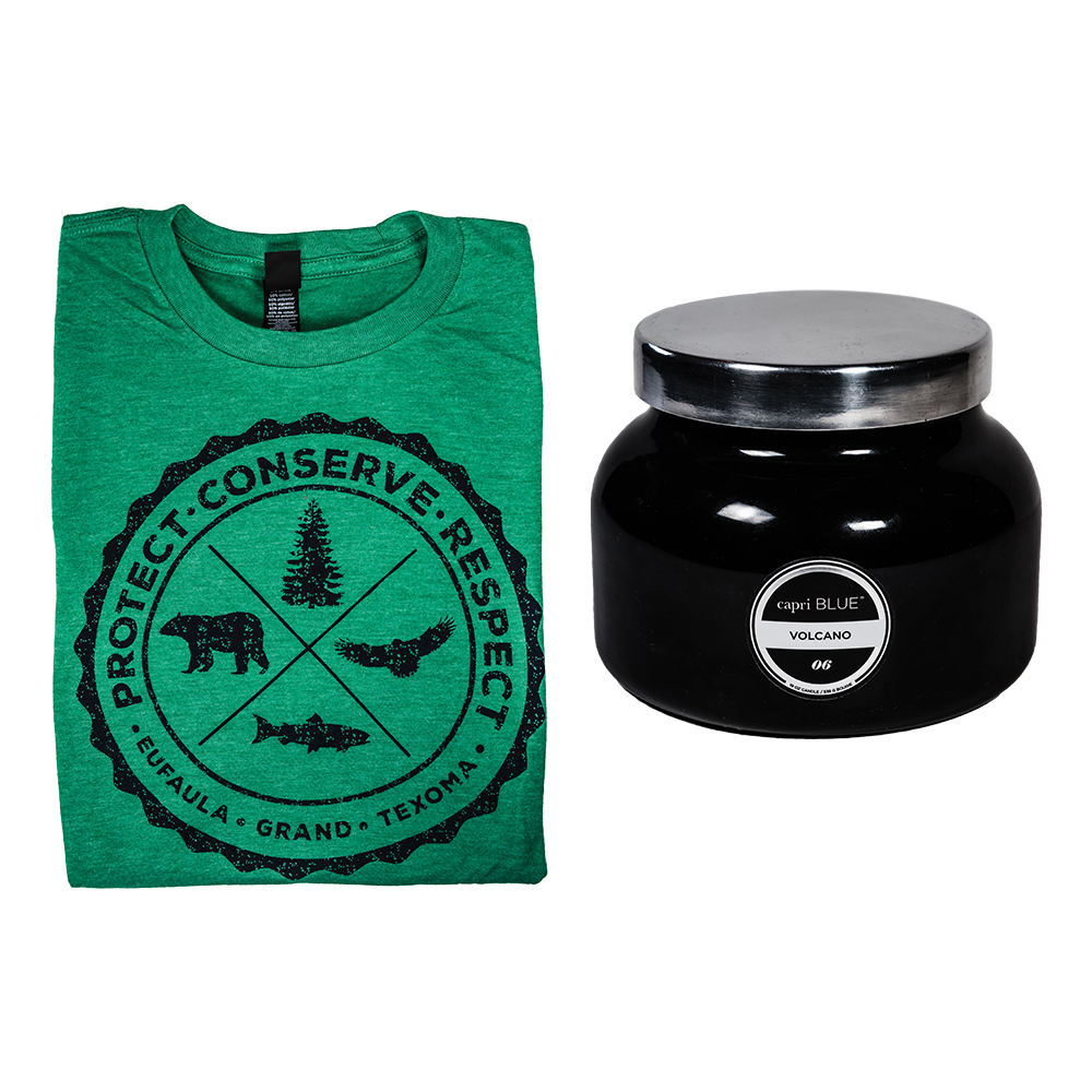 T-shirts, $20 “I love our T-shirt line because we love to represent ‘Oklahoma proud.’” // (right) Volcano Capri Blue candle, $26 “The volcano scent from our Capri Blue line of candles has been my favorite for 20 years; its strong and distinct aroma lasts and lingers forever.”