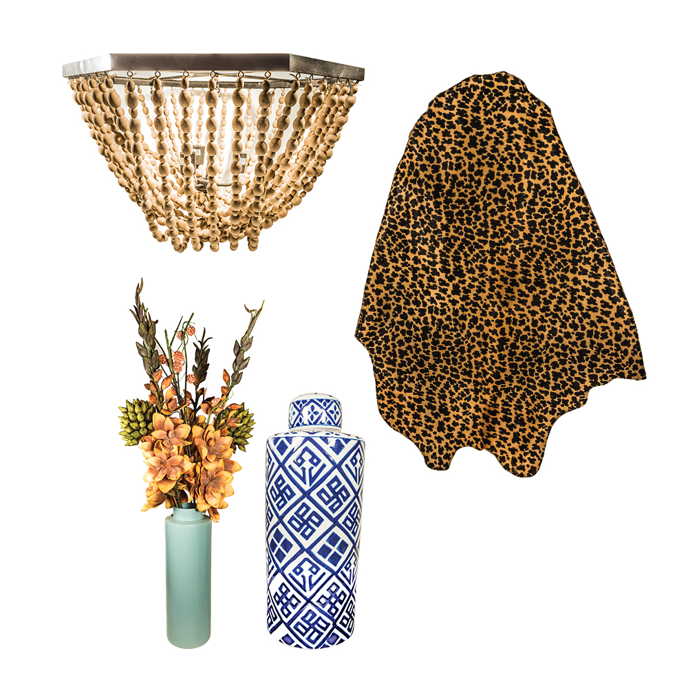 Wooden beaded Boho chandelier, $250 “This Bohemian beaded chandelier adds an organic feel to a space that’s warm and feminine.” //  Leopard print cowhide rug, $250 “I’m obsessed with patterned, printed cowhides, like this leopard print one, because it’s a classic pattern and adds a chic style that looks both elegant and eclectic.” // Blue vase, $30; Botanical stems from $8 “These botanical stems add color and whimsy to dull spaces, [and] I love this tall blue vase for the height and simplicity.”