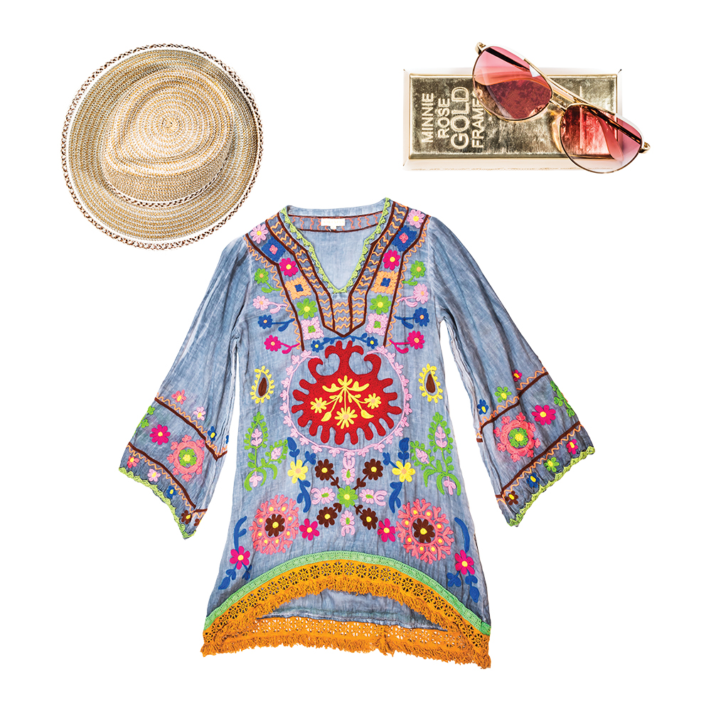 Big Deal fedora, $170 “A staple in my closet.” // Minnie Rose gold frames, $189 “One of my summer essentials!” // Ruby Yaya tunic, $165 “For a fun and colorful outfit to run around town – you can dress it down with a hat and sandals, or dress it up go out.”
