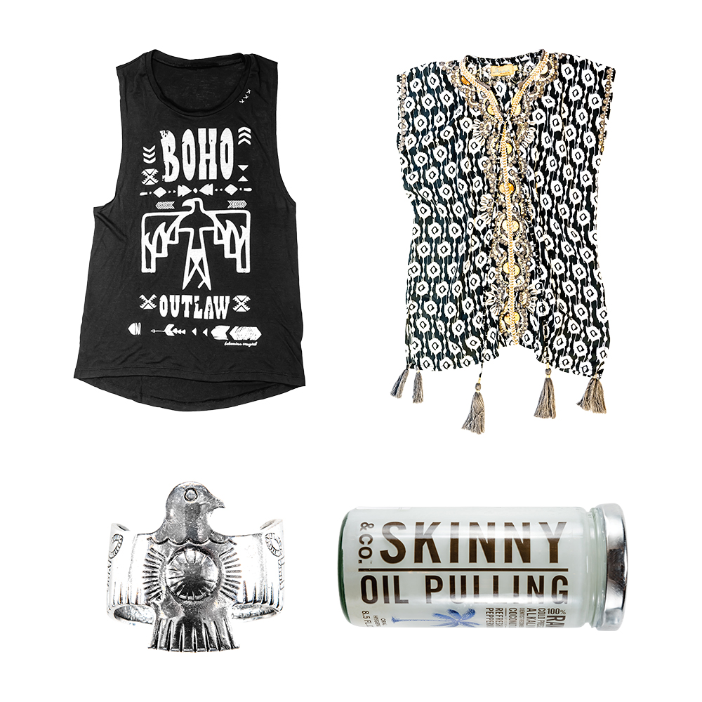 Boho Outlaw tank, $59 “This is perfect for unleashing your inner Boho.” // Skemo Mommy and Me kaftans, mommy size $144, little girl size $72 “These are some of my favorite mommy-and-me outfits for my little daughter Tatum and I to wear.” // Skinny & Co. oil pulling kit, $32 “This is my favorite body-slimming cream.” // Thunderbird cuff, $64 “My favorite accessory to wear when headed to a summer festival.”