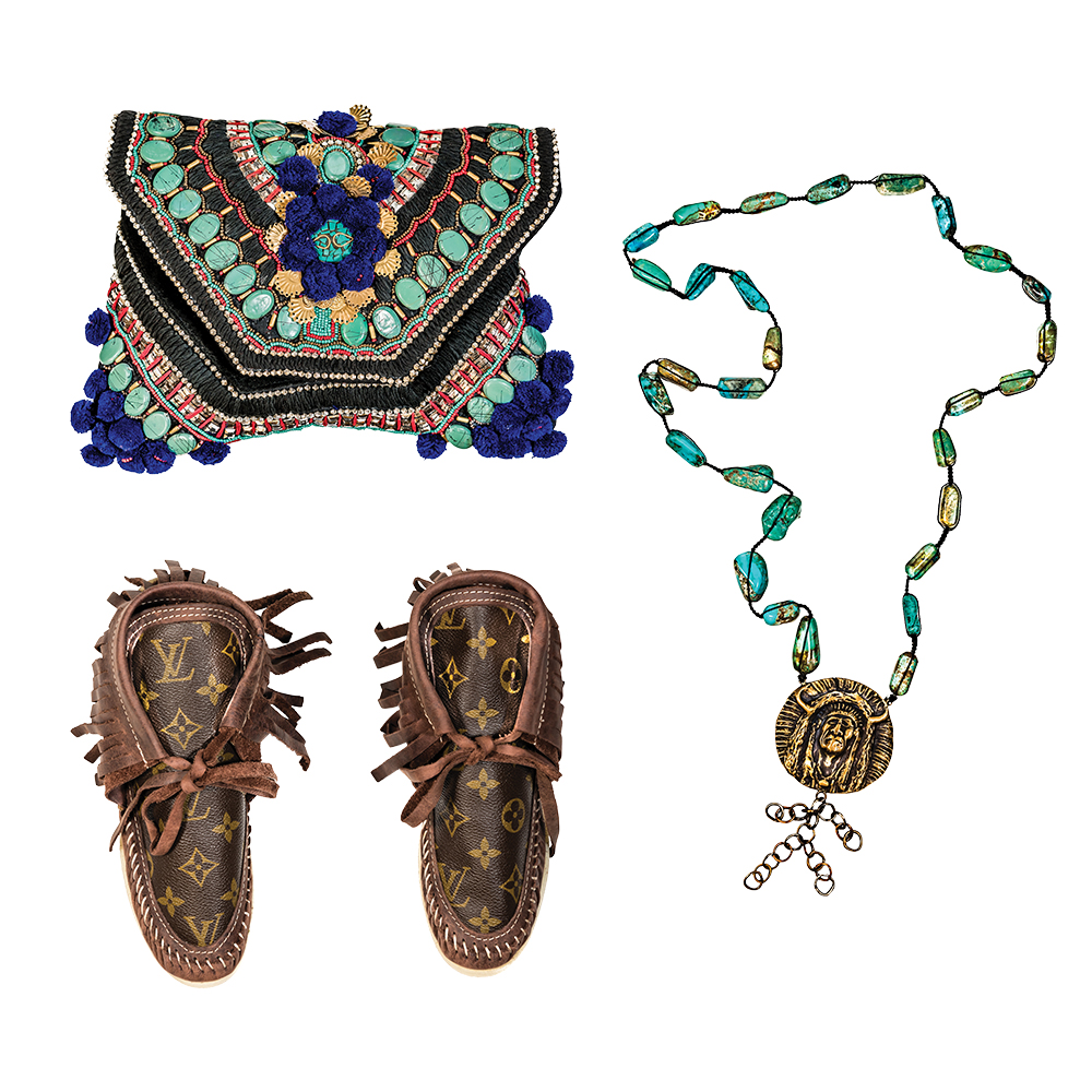 Pom-pom clutch, $149 “A must-have in any summer wardrobe.” // Love Tokens handcrafted turquoise necklace by local artist Stacey DeGraffenreid, $545 “These stunning pieces are some of my most prized possessions, and should be on any fashionista’s list.” // Louis Vuitton moccasins, $499 “No Bohemian babe can go without these to romp around town in!”