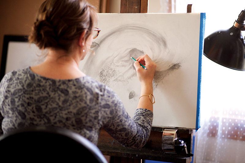 Those early drawings were in pencil – a medium that Prestifilippo has mastered, if her recent work is any indication. She was a featured artist at this year’s Momentum, the Oklahoma Visual Arts Coalition’s annual curated exhibit for artists 30 and younger. Included with her display pieces, all of which were graphite on paper, was an interactive work called “What Could I” that the audience was allowed to alter … actually, they were asked to erase pieces of it.