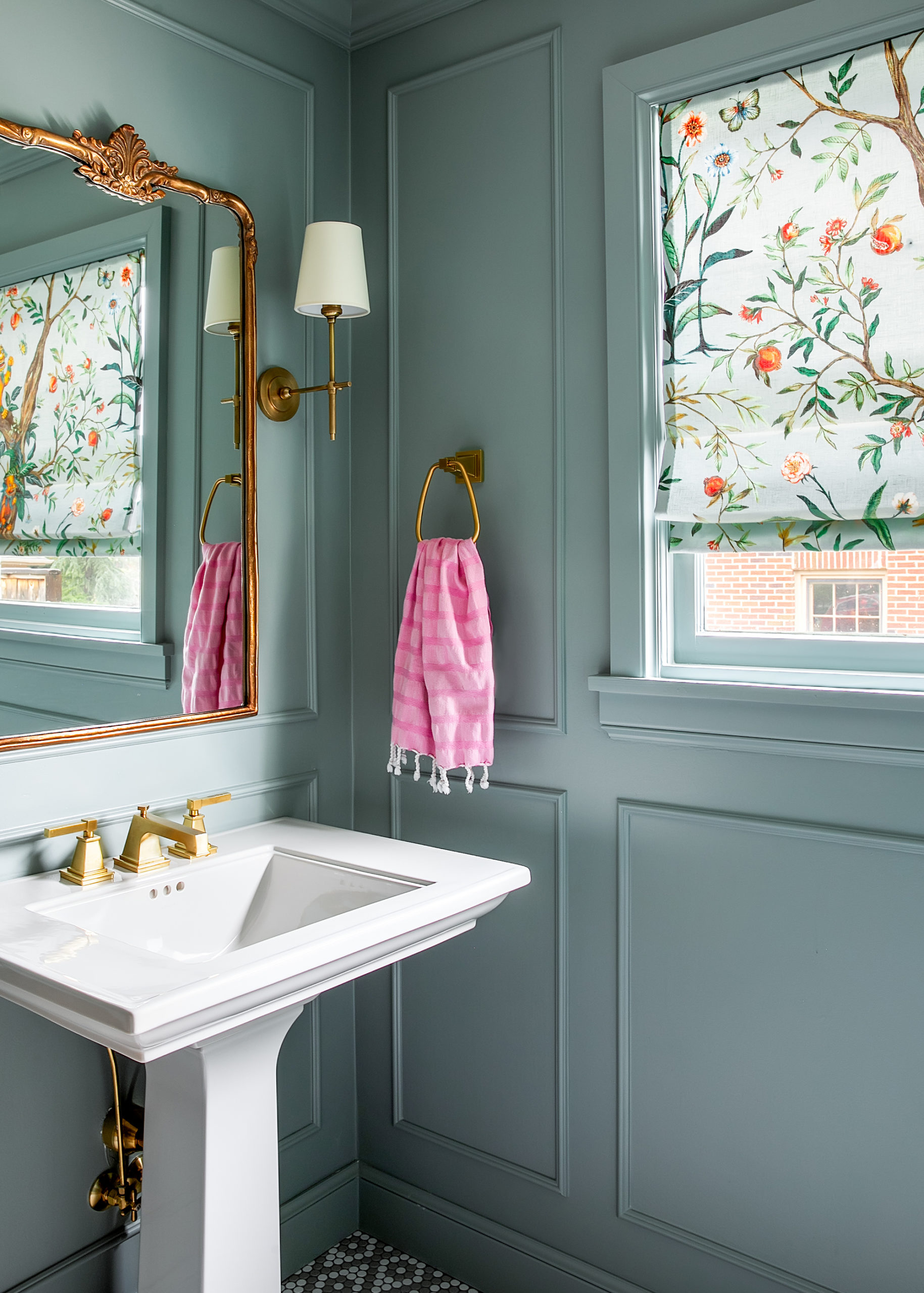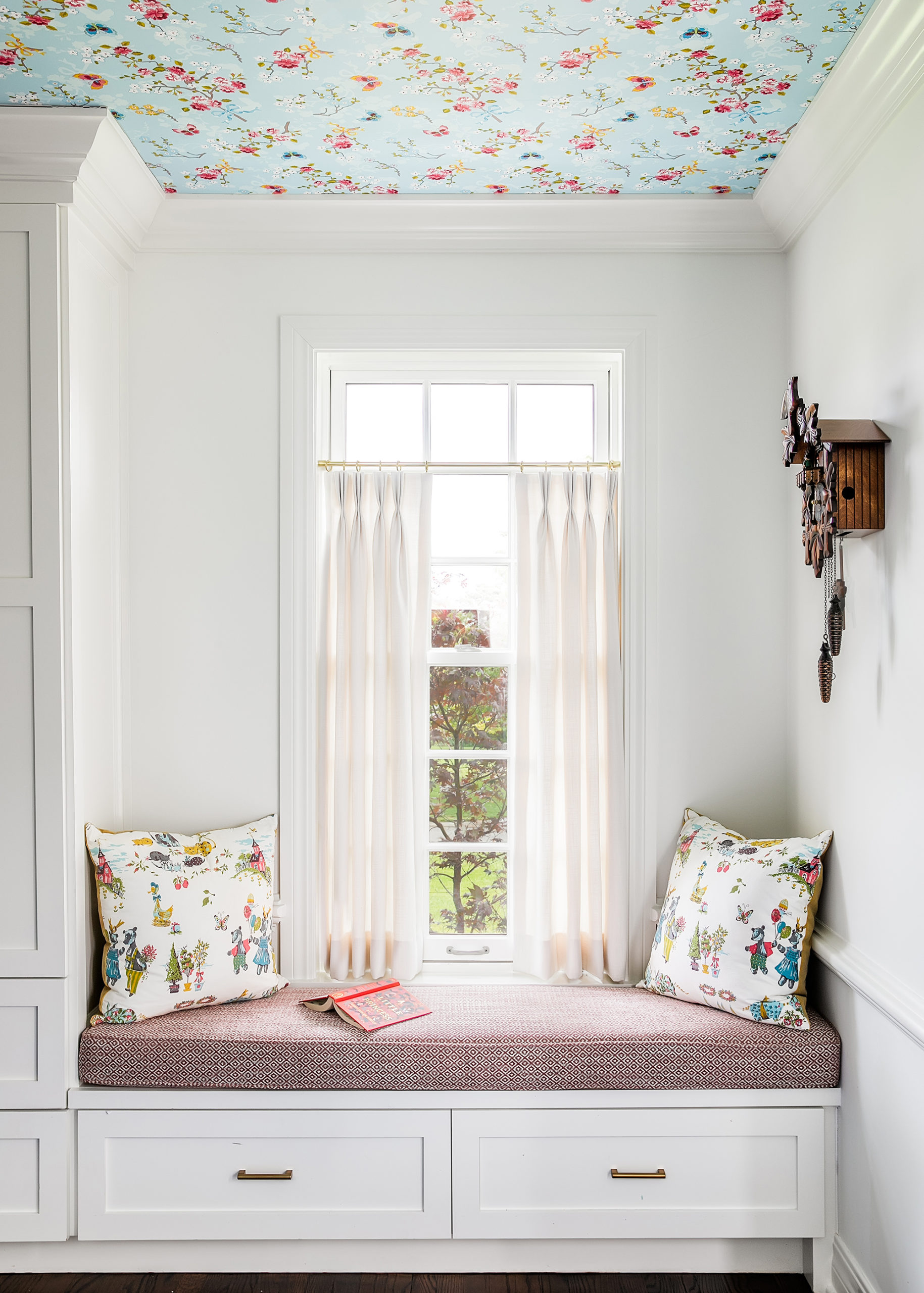 Colorful punches can be spotted in every room. One example is the wallpapered ceiling in the playroom: The walls were painted white to reflect the airy, sunny feel of the bay windows, so the wallpapered ceiling brings in the pattern and colors. Another wallop is the small bathroom in the back of the home—a color explosion with awe-inspiring details.