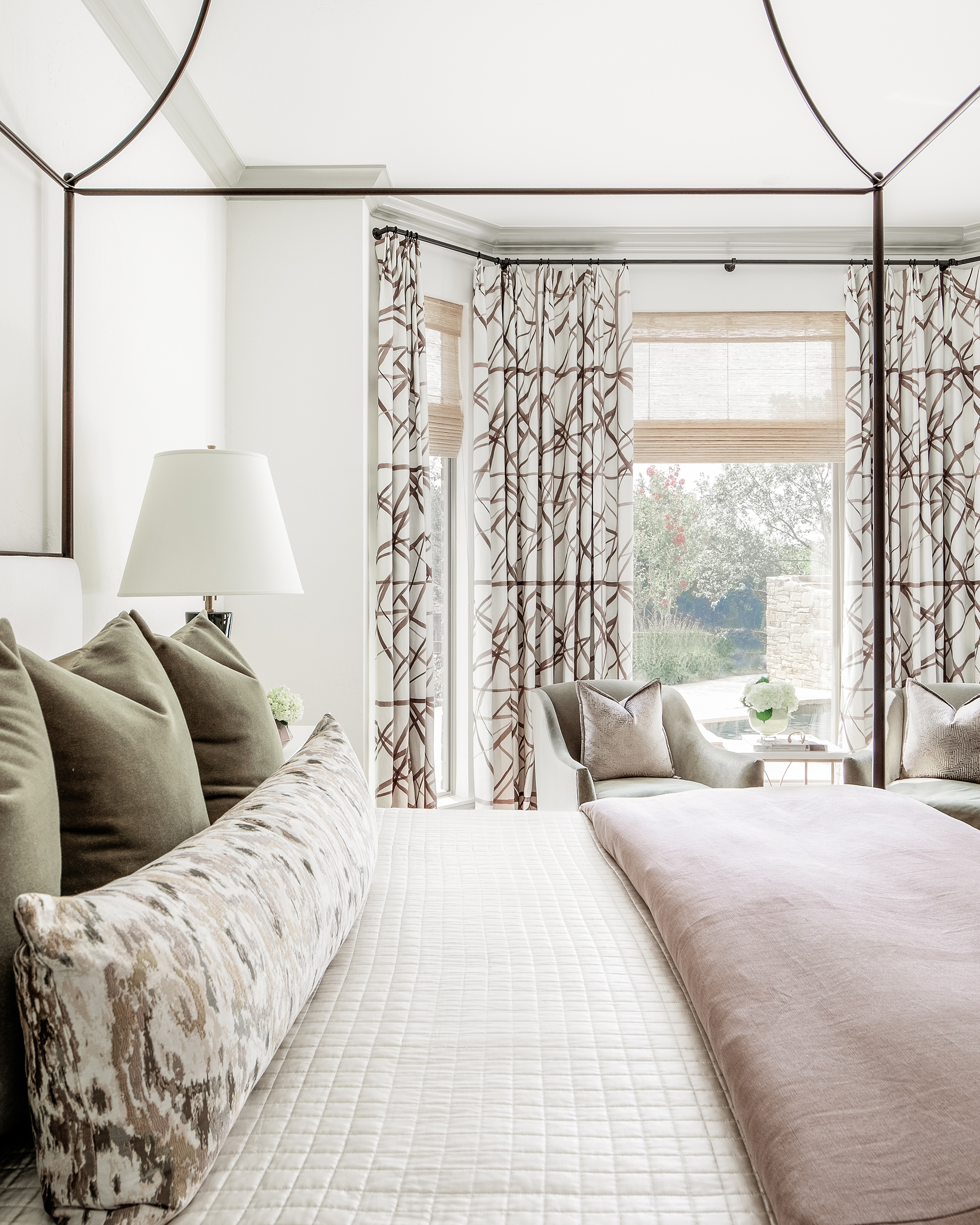 The bedroom features an impressive iron canopy bed by Made Goods and an inviting sitting area. Matlack used pocket doors between the bedroom, bathroom and closet to maximize space. She also strategically placed sconces to create layers of lighting, one of her go-to design tactics.
