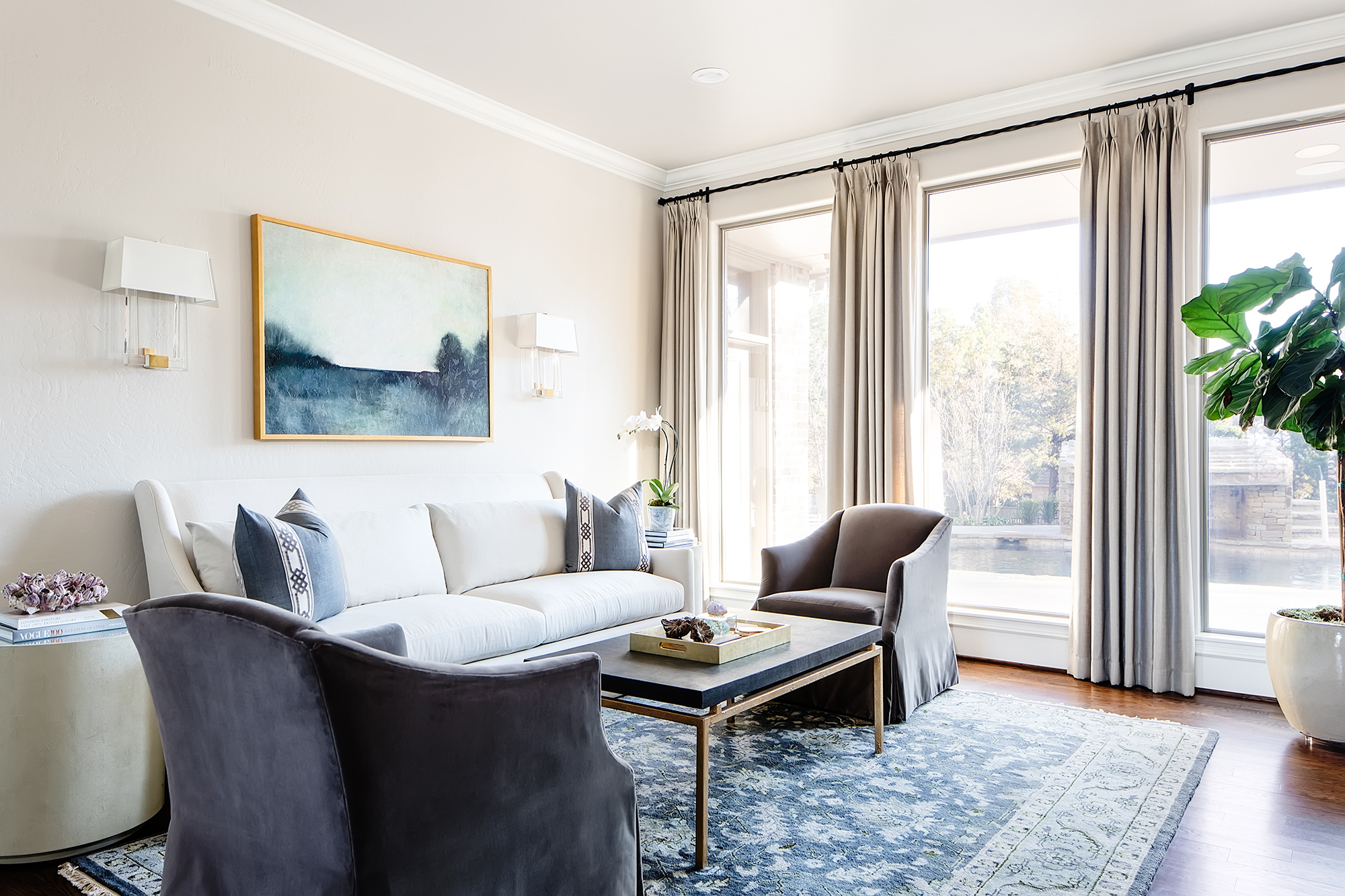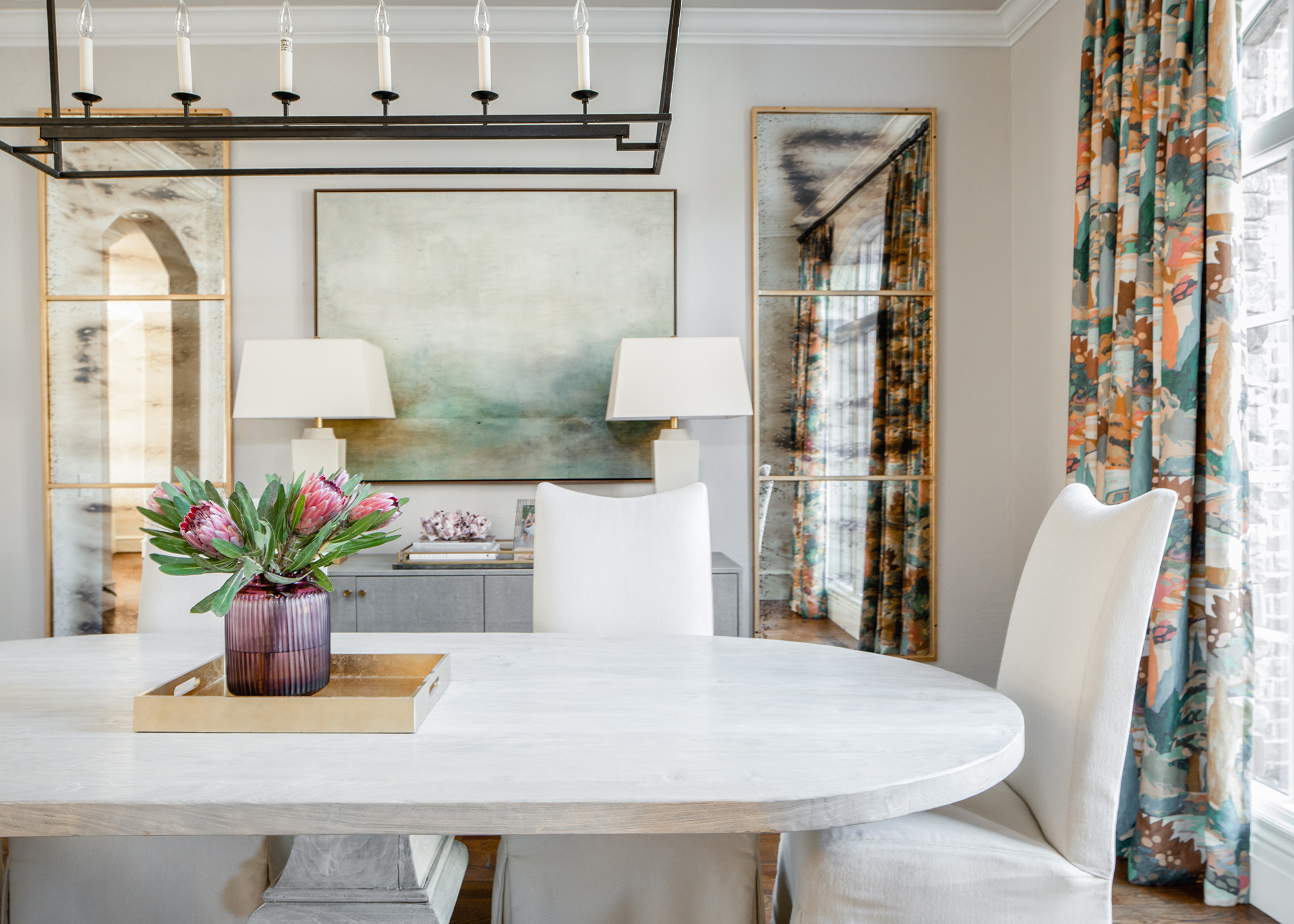 The color paired nicely with newly painted white woodwork. The rooms open up to each other, so using the same colors in both spaces created a better flow. The dining room draperies – in a Beacon Hill by Robert Allen fabric – added color and softness. Matlack selected Visual Comfort light fixtures and Lee Industries furniture pieces to finish out the rooms.