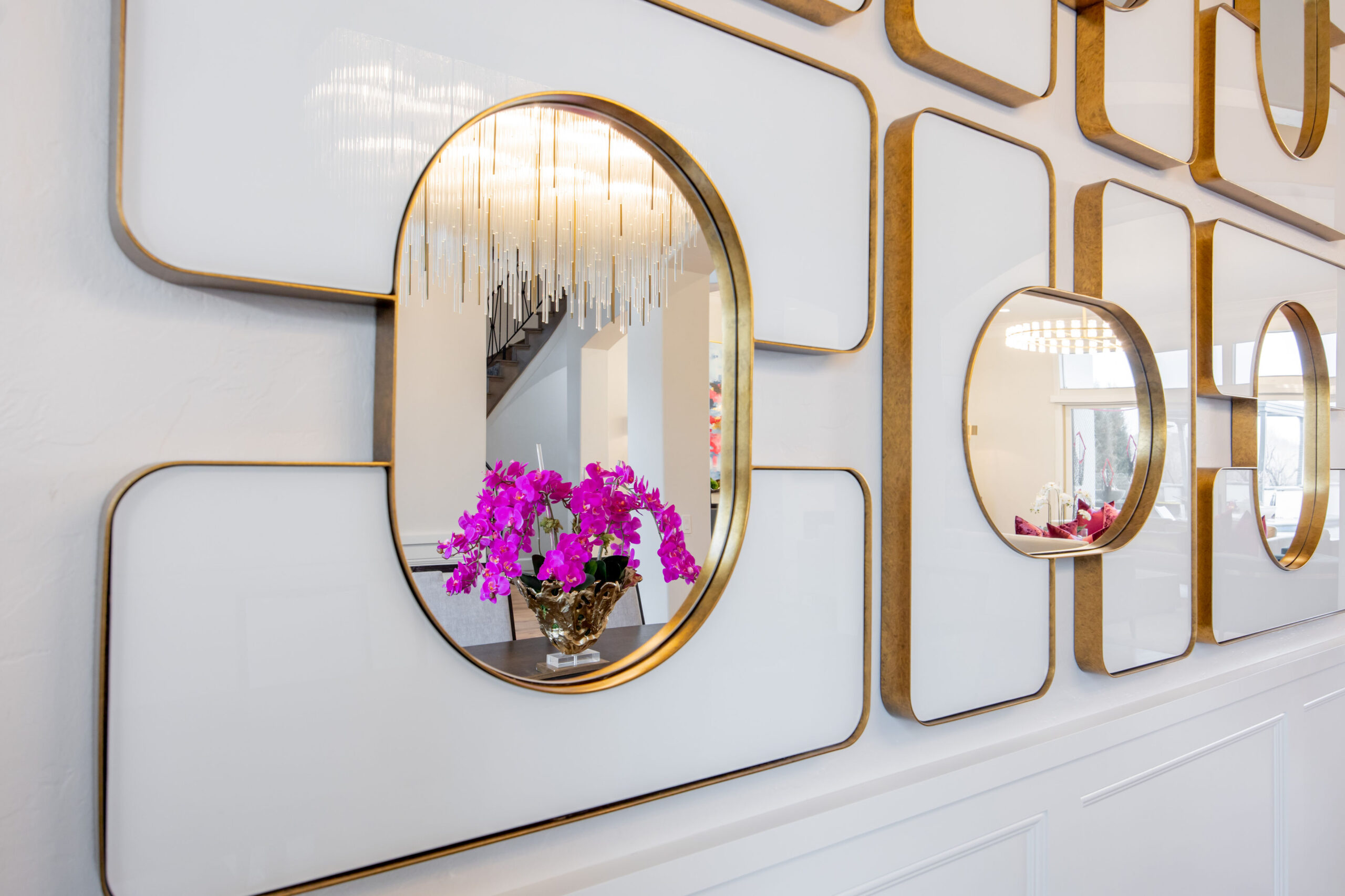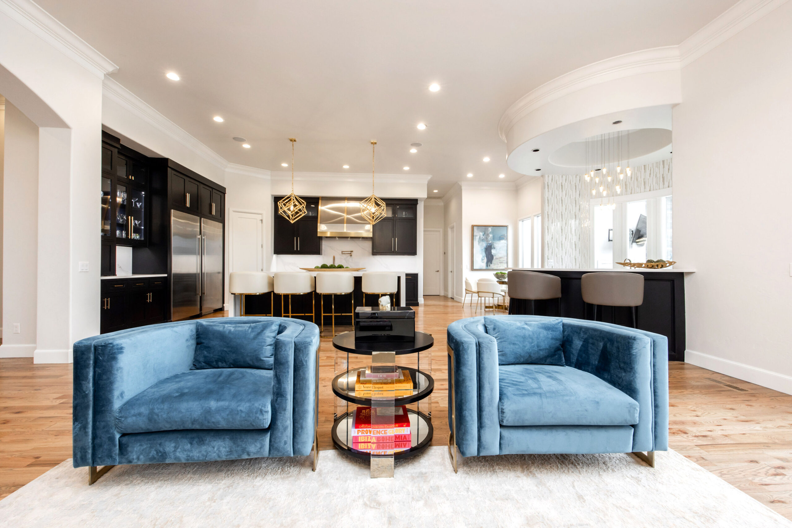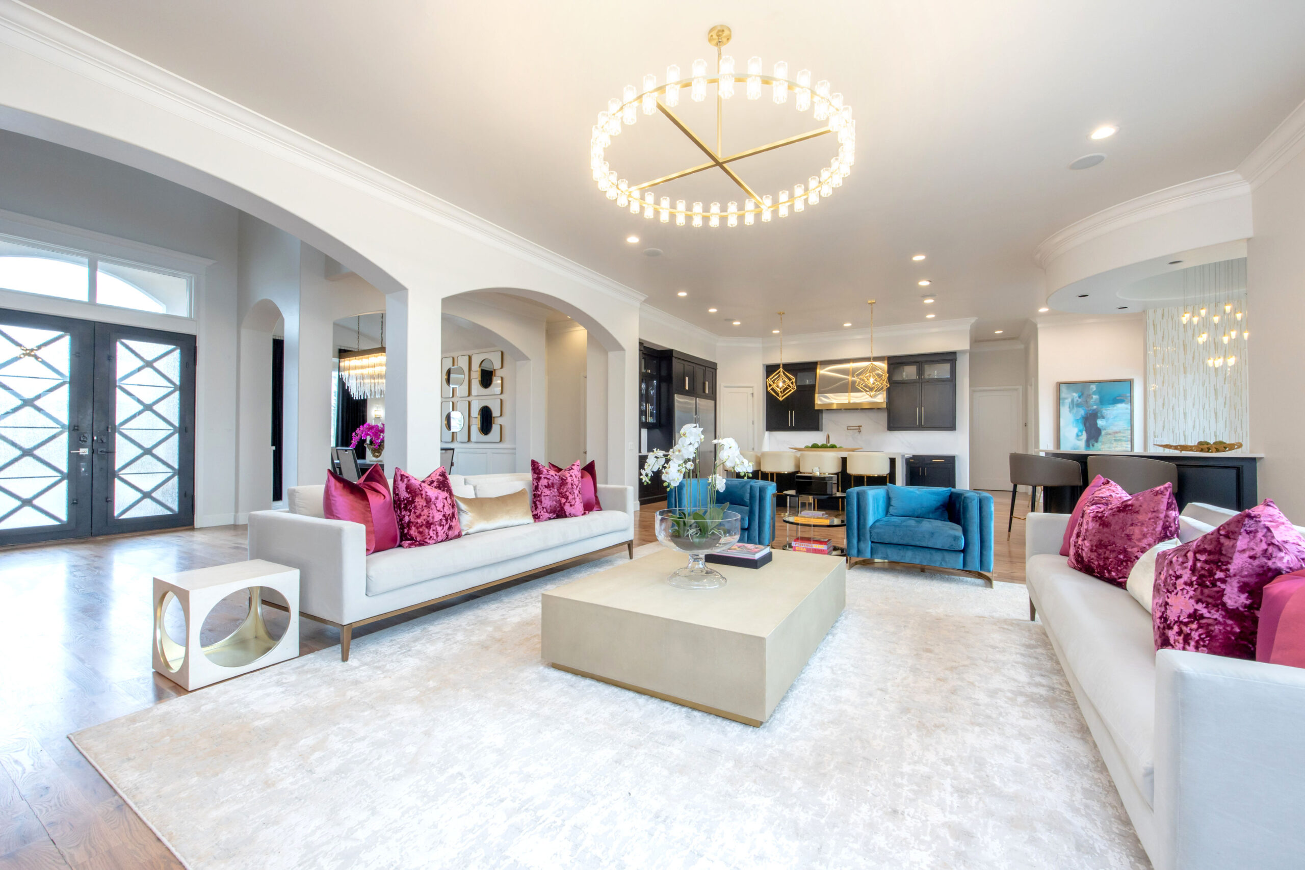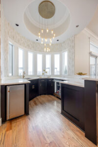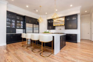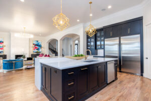 The home’s road to transformation was not without surprises: A broken ice maker—and the ensuing flood—forced a kitchen overhaul. Rickey completely reimagined the kitchen, adding new cabinetry, a custom vent hood, a functional island and a striking circular bar area designed to be both functional and visually stunning, with marble and gold inlaid mosaic tile. Statement-making, golden light fixtures were installed in the kitchen and bar, as well as throughout the home.