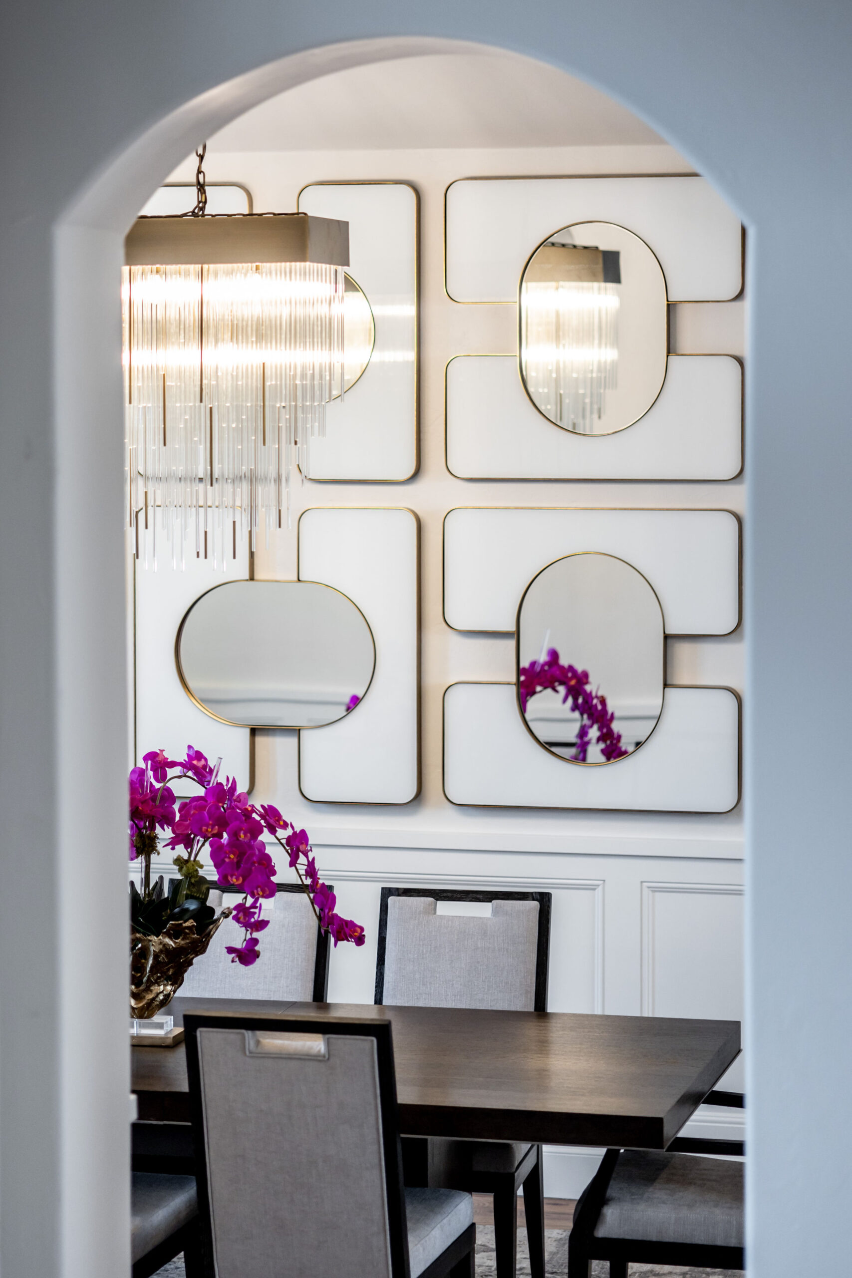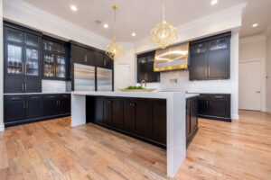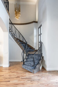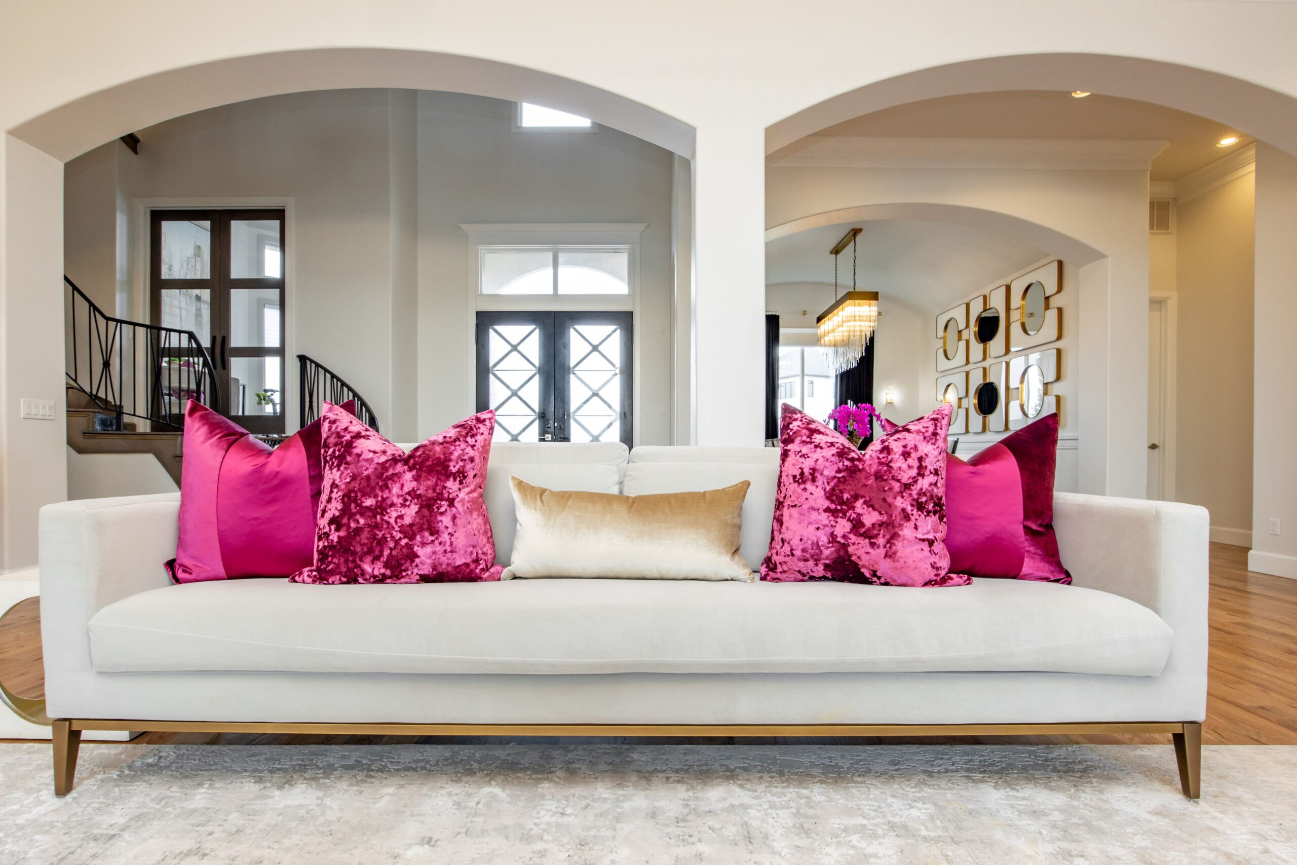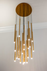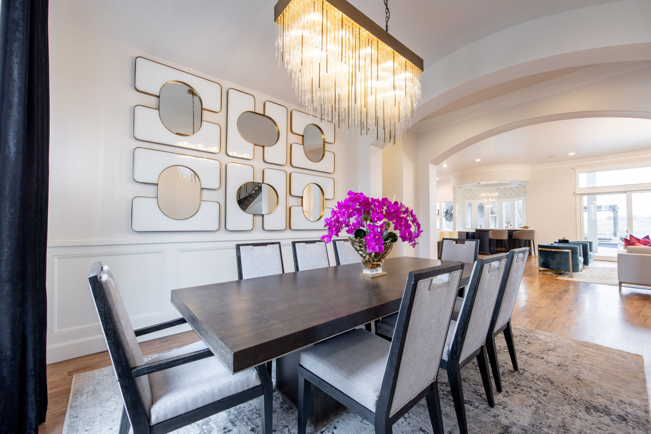 The home’s road to transformation was not without surprises: A broken ice maker—and the ensuing flood—forced a kitchen overhaul. Rickey completely reimagined the kitchen, adding new cabinetry, a custom vent hood, a functional island and a striking circular bar area designed to be both functional and visually stunning, with marble and gold inlaid mosaic tile. Statement-making, golden light fixtures were installed in the kitchen and bar, as well as throughout the home.