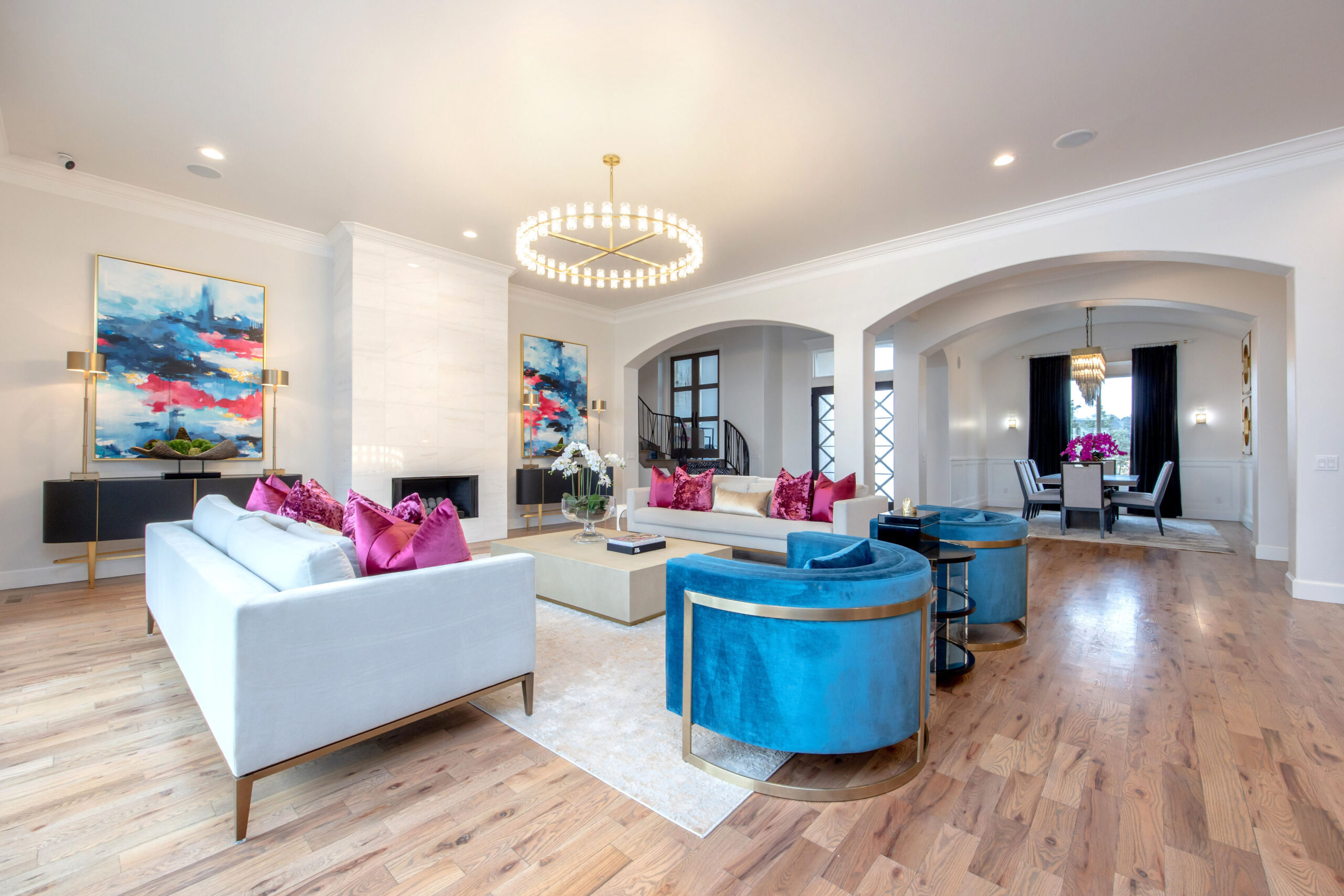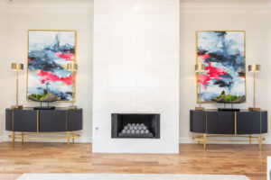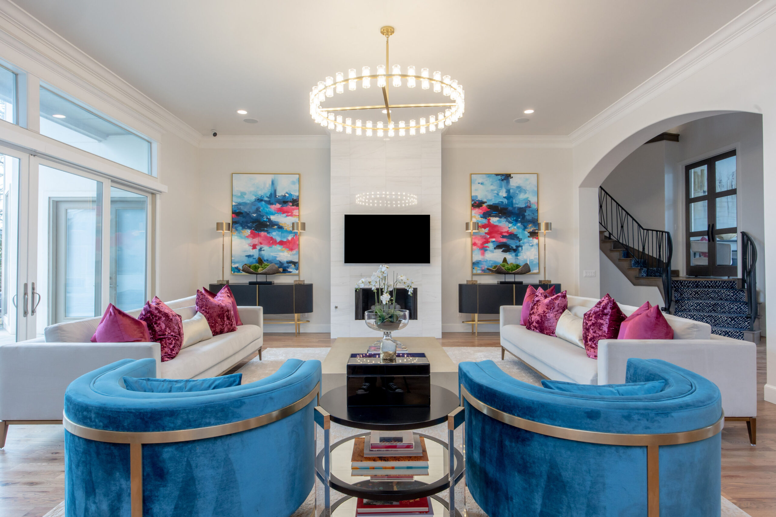 Brewer purchased a pair of blue velvet chairs to complement the art. While she knew she wanted to keep all of these items in her home, she needed help placing them within the larger context of the surrounding rooms. Rickey responded with a cohesive, creative plan.