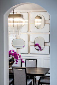 Today, these special art pieces reverberate through the bright pinks and teals found in textiles, accessories and furniture. The living room, one of Brewer’s favorites, features mirrored sofas with bright pink velvet throw pillows. (Rickey admitted she has a preference for pink, calling it her “signature color.”) The room’s symmetrical layout feels balanced and elegant, with the artwork fully celebrated.
