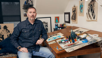 Dylan Cavin’s ink wash works take a page from the past, combining images of buffalos, Western characters and Indigenous people