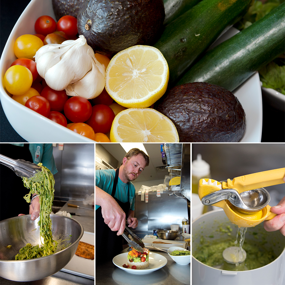 Over the summer, they worked up a simple dinner recipe that does not require a lot of prep time, and, depending on the preparation, can be super healthy. Mays used zoodles (zucchini noodles), but you can use pasta, too. The most important component is probably the avocado pesto, a sauce that he said is a great one to keep in your “culinary bag of tricks.”