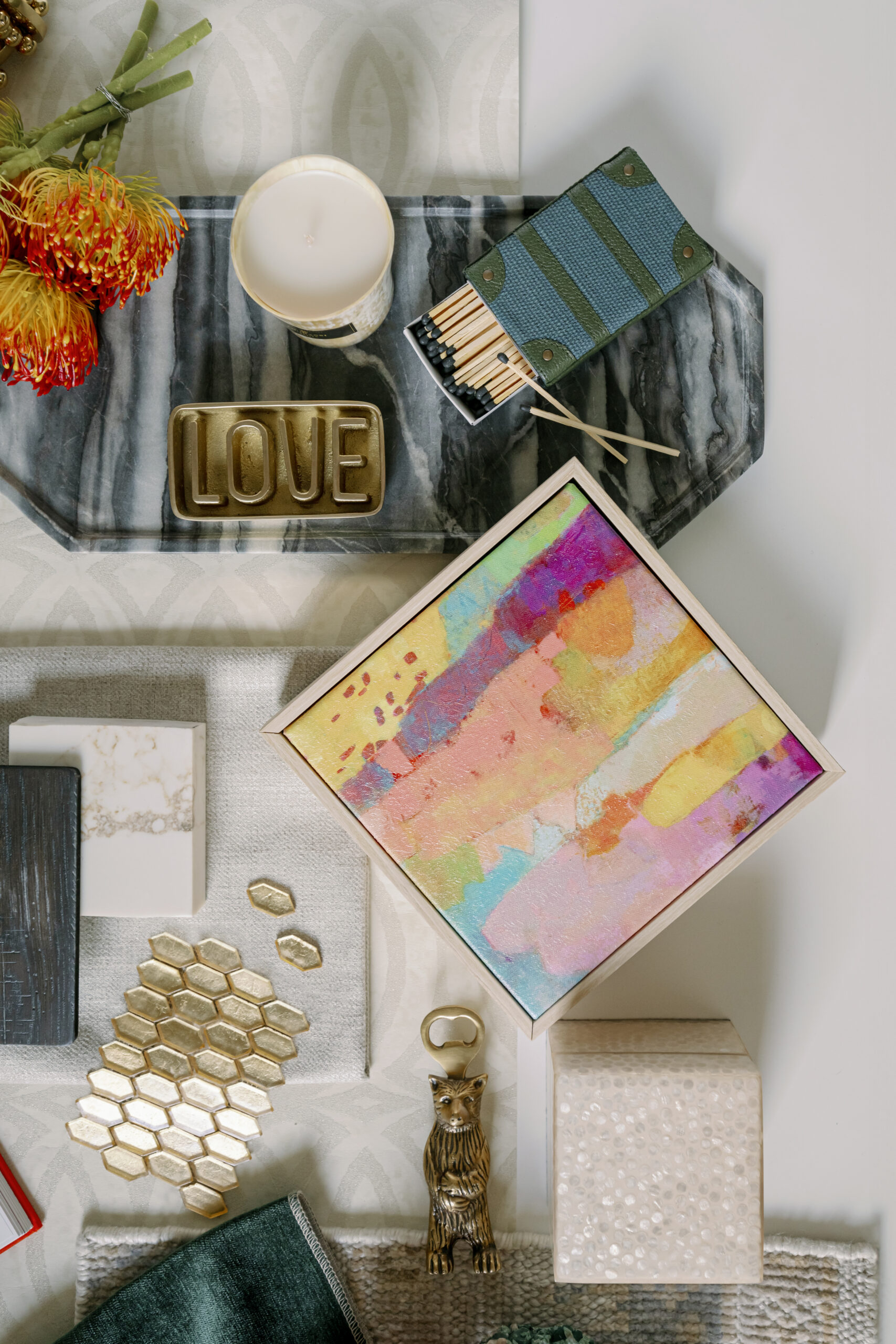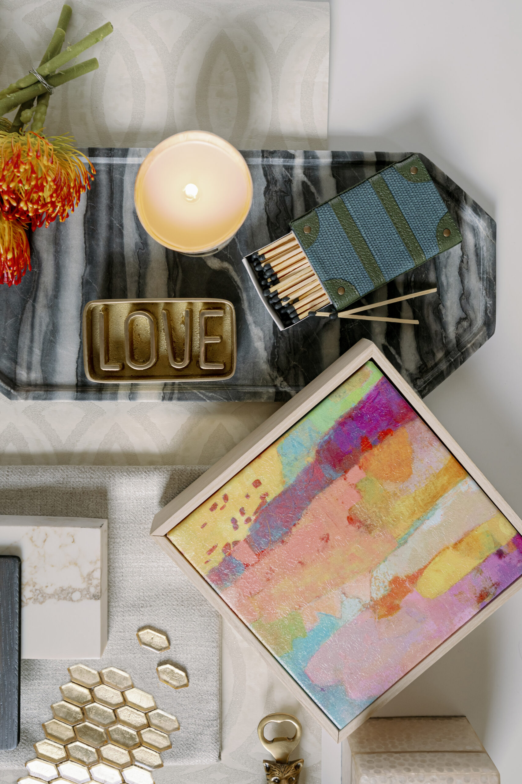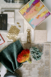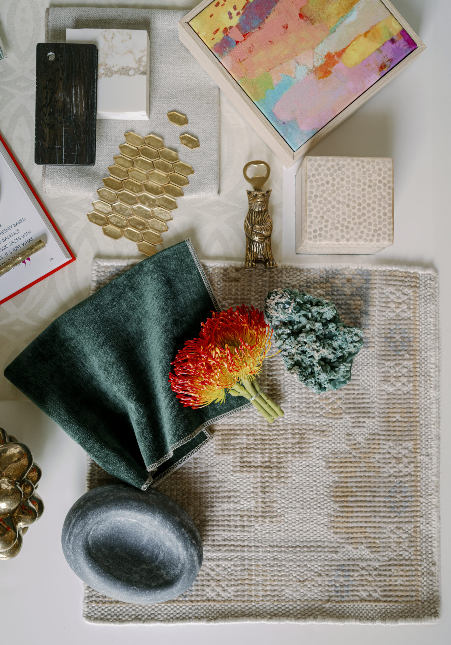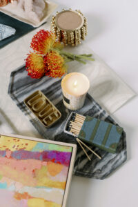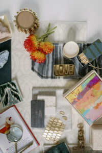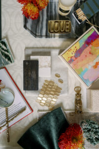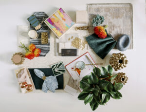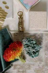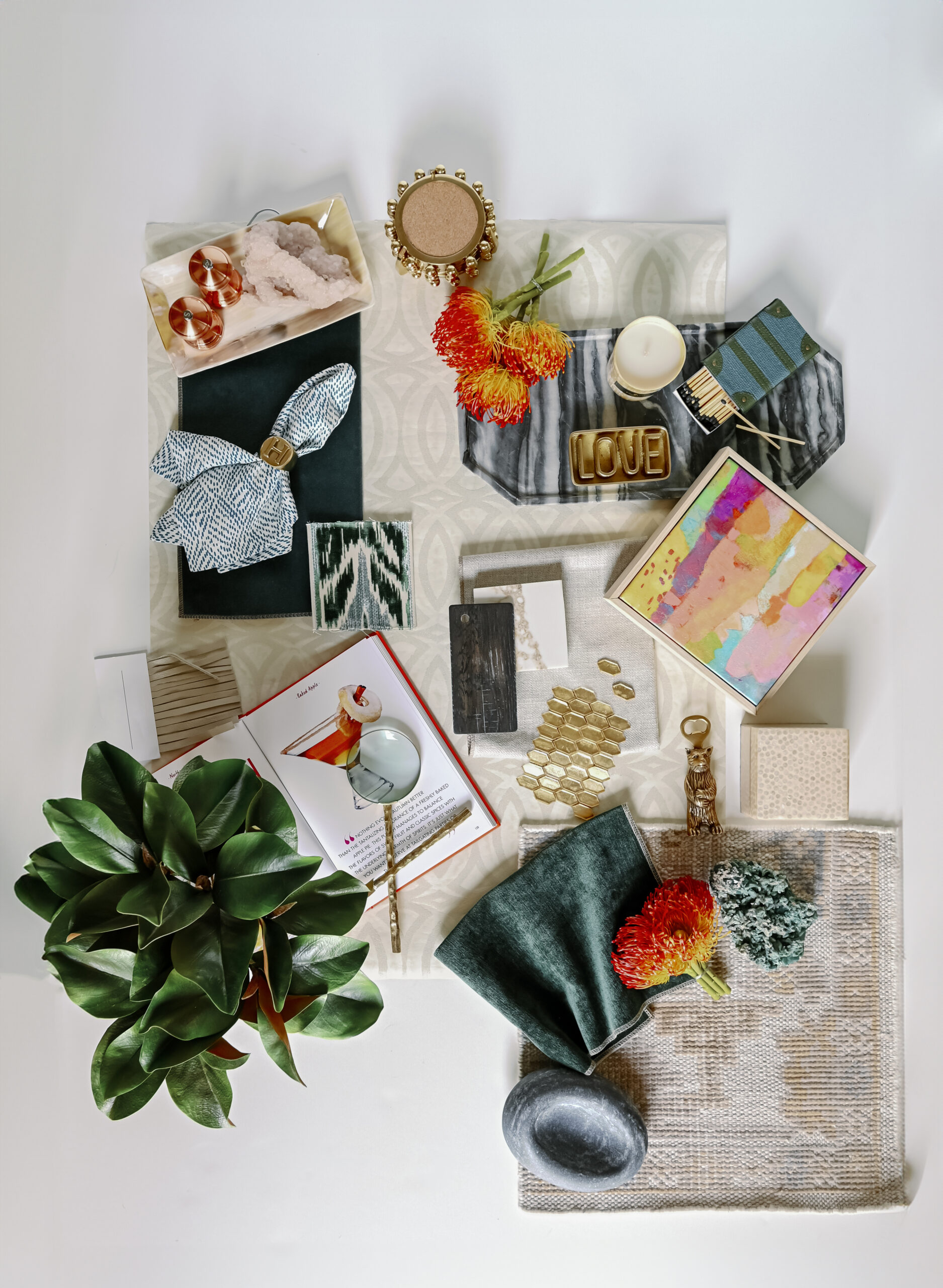 Katelynn Henry with Henry Home Interiors designed this seasonal Mood Board, drawing substantial inspiration from a client’s appreciation of the mountains and nature—with hints of glitz. The greens, golds and luxe neutral tones usher in fall vibes. Art Deco wallpaper, a smooth marble tray, golden tiles and a soft taupe leather fringe are complemented by emerald green fabrics and trim. Magnolia branches and Protea stems add natural textures, as do the shimmering agate crystals. Home decor items—such as the Thucassi Torsten natural horn candle, miniature painting (one of a series) and smooth stone dish—all come from Henry Home Interiors. Napkins, coasters and a “baked apple” cocktail recipe remind us that fall is near. Time to think about your own Thanksgiving table, perhaps? For decorating ideas, view Henry’s well-set Gatherings table HERE. The table setting was photographed in the aforementioned client’s dining room, bringing this nature-meets-glam Mood Board full circle.