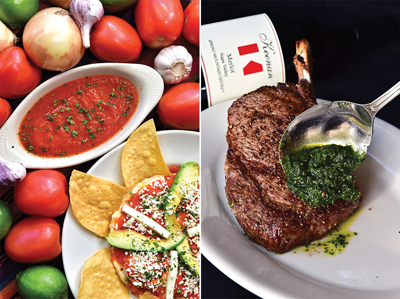 Café Antigua’s montuleños (left) include a zesty dose of Guatemalan sauce chirmol; chimicurri adds a little spice to a bone-in ribeye (right) at Mahogany Prime Steakhouse.