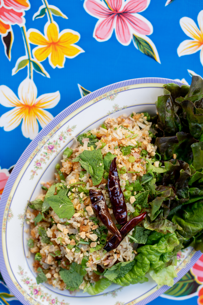 Crispy rice salad (nam khao). Photo by Rachel Maucieri.