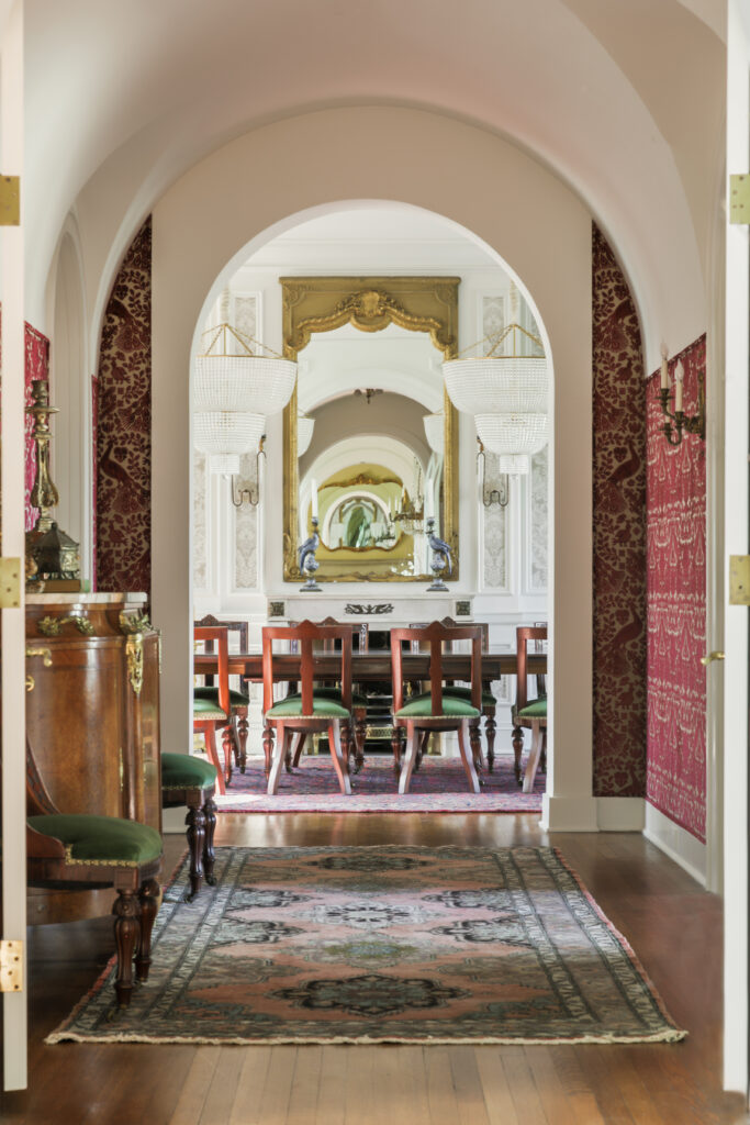 The room’s archived wallpaper, “Kanchou” by Brunschwig & Fils, encapsulates that special feeling, and thoughtful details such as this were incorporated into the entry design to honor the timelessness of the home.