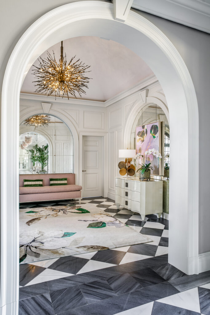 Heightening the drama of the space, Bolen combined a beautiful bronze and jewel chandelier with black, gray and white marble floors. A French contemporary lamp and new artwork bring a fresh feel to the design, while a magnolia-themed Vivienne Westwood rug adds intrigue.