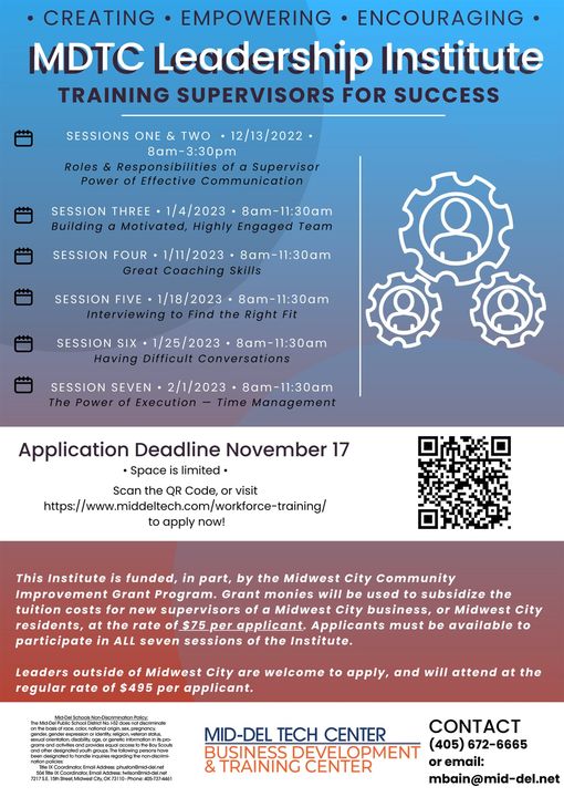 The Mid-Del Technology Center Business Development & Training Center is launching its Leadership Institute to train supervisors in seven training sessions starting in December and running through February 2023.