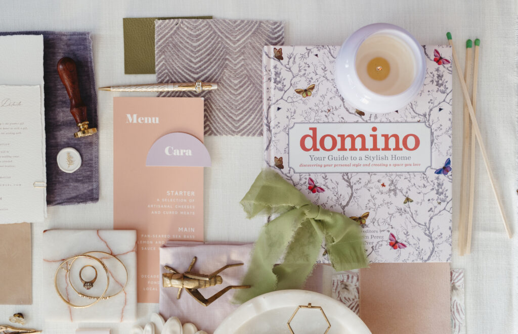 As an interior designer, Snow knows how important it is for newlyweds to establish a new home together—hence the purple patterned fabrics from Fabricut and Domino book providing “Your Guide to a Stylish Home.” Other interesting textures are layered throughout this moodboard: silk tassels, a marble bowl and samples of wood, leather and linen.