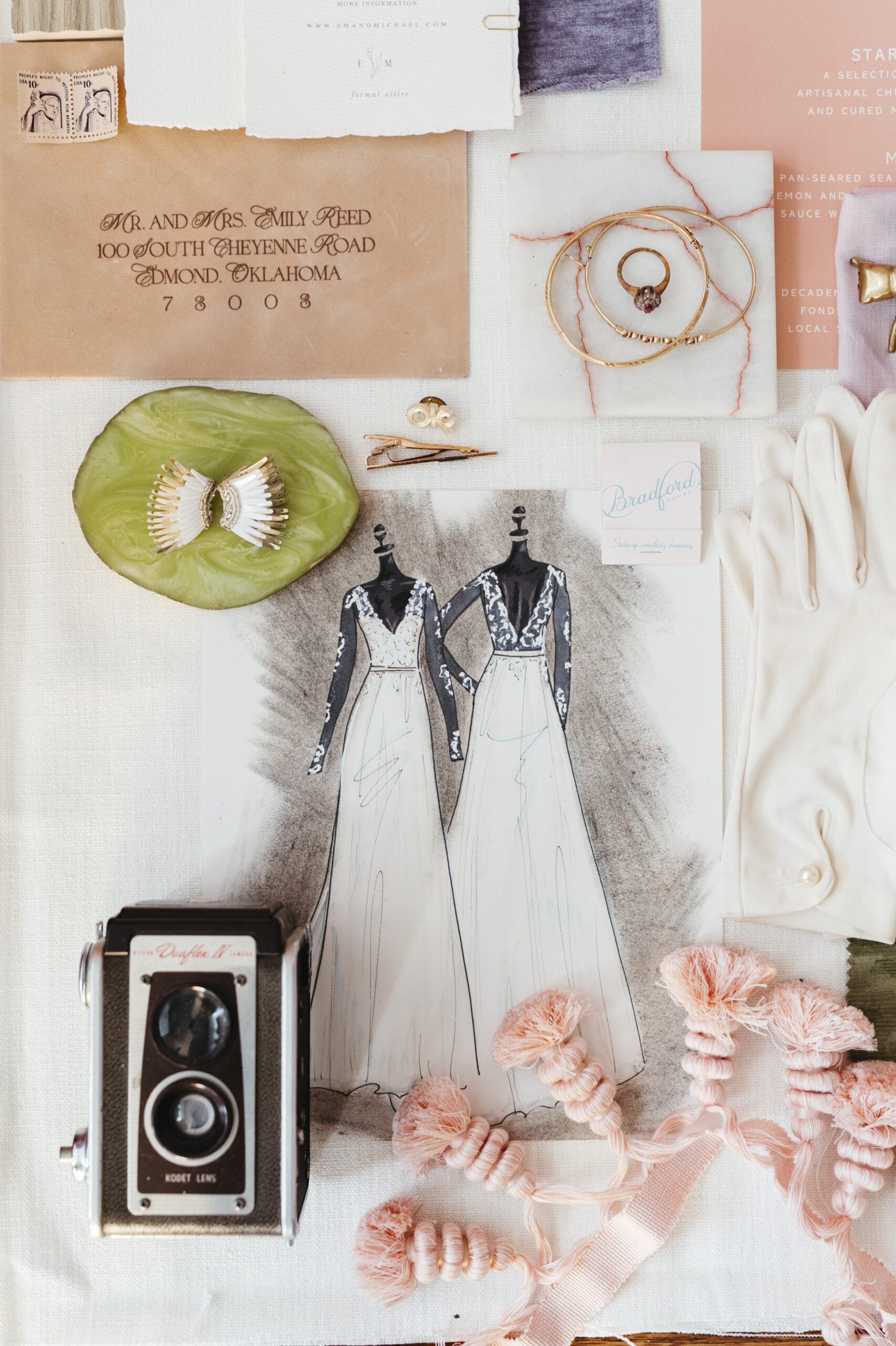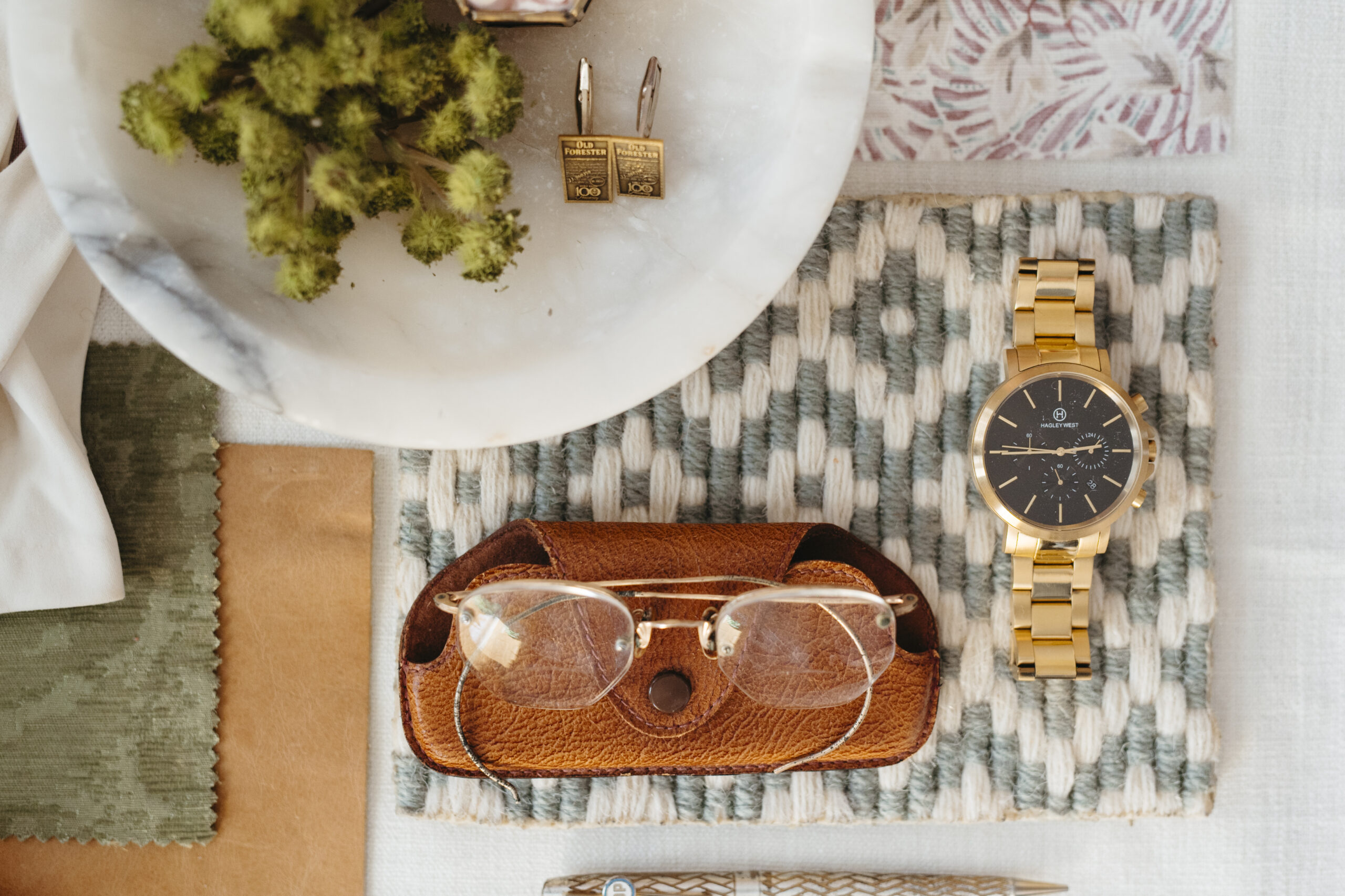 Preparing for the big day, the bride and groom gather goods to dress their best. The pearl-embellished gloves and wire-rim glasses introduce elements from another era, as do the vintage tie clip and lapel pin worn by Snow’s husband. (He still sports these items at fancy events.)