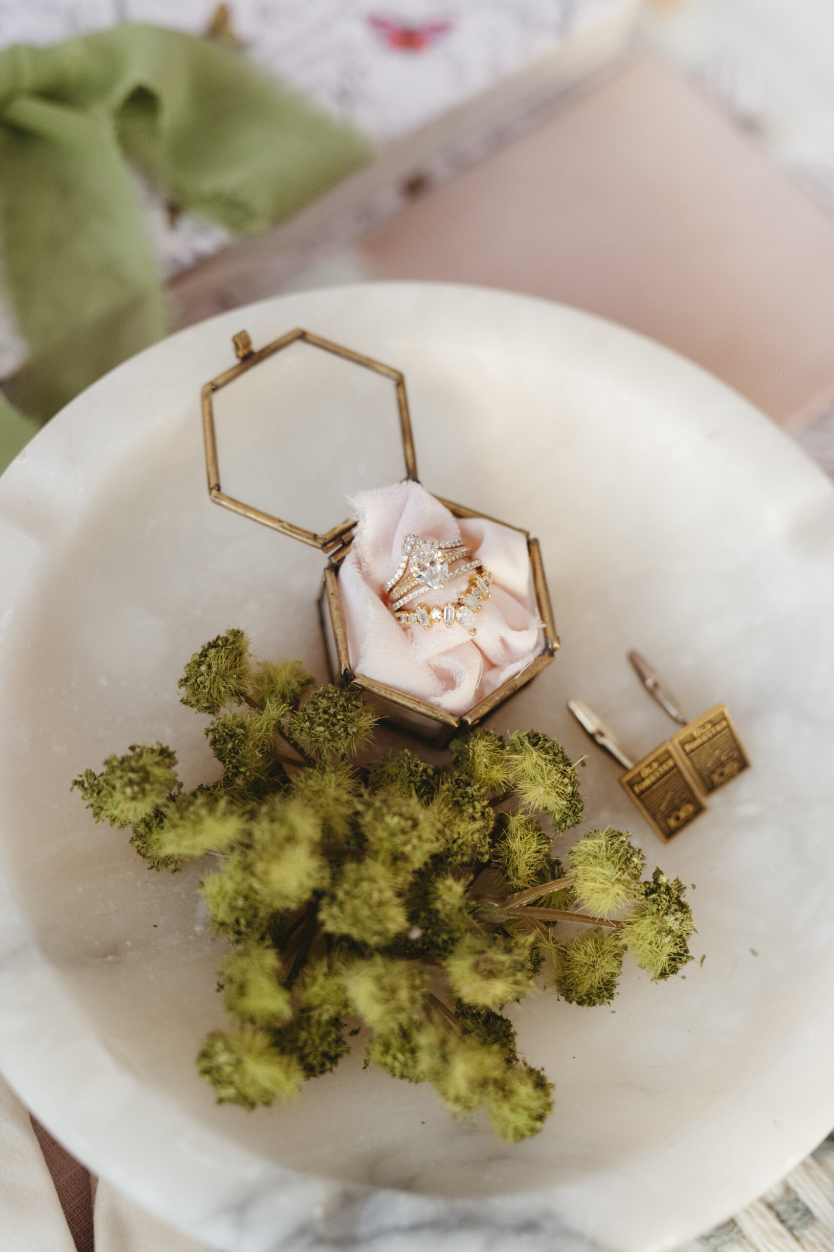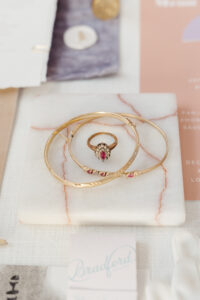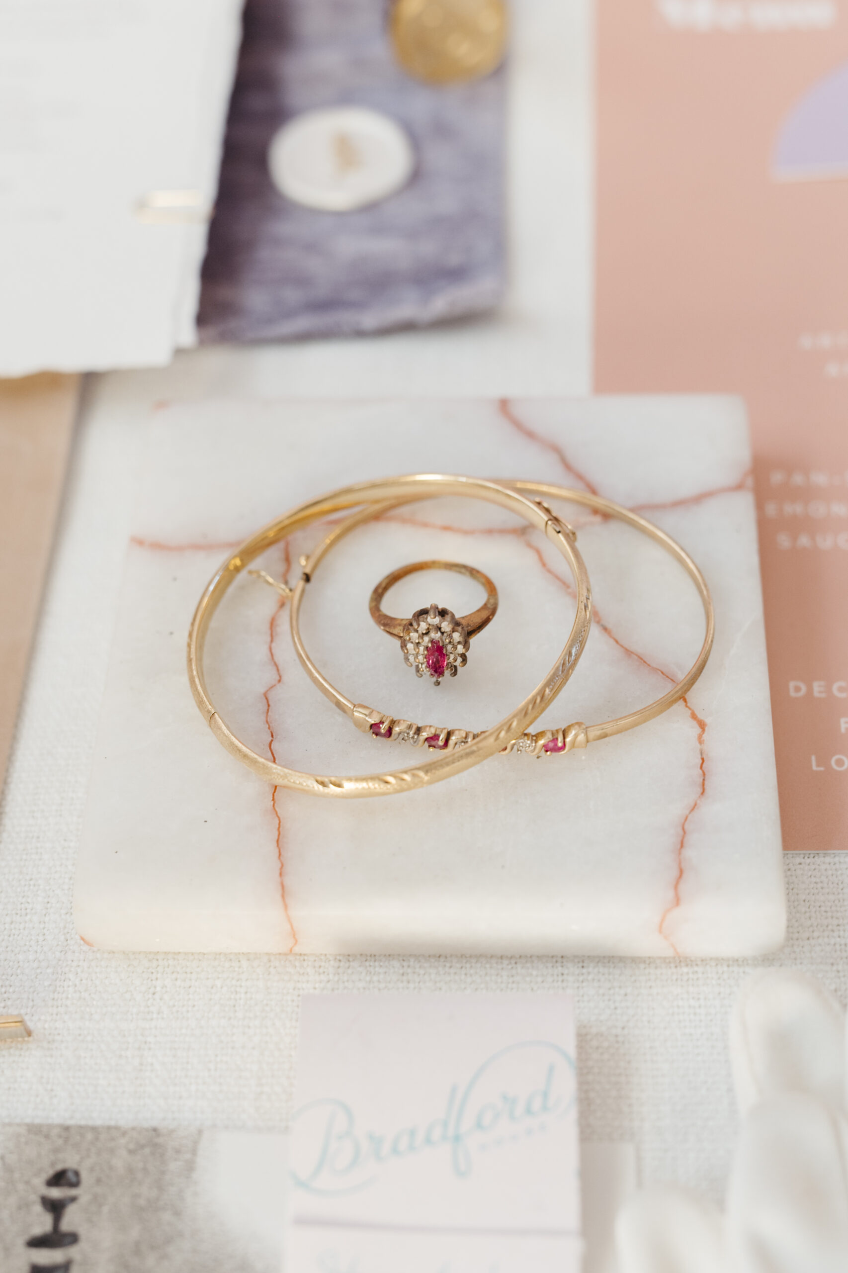 The various gold jewelry pieces also come from Davison’s wedding day. The vintage-boho earrings (something old), family heirloom gold bangles and ruby ring (something borrowed) and sparkling wedding bands (something new) had her covered. Davison collaborated with J. Thomson Custom Jewelers on her wedding ring’s design, incorporating diamonds she inherited from family. And the ruby ring actually sustained a house fire. In fact, it was the only piece that survived. Its beauty lives on.