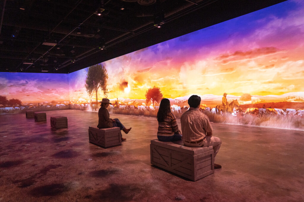 To create The Cowboy, the museum partnered with Lighthouse Immersive, producers of the wildly successful Immersive Van Gogh. A gallery within the museum has been completely transformed into a captivating 360-degree environment. Guests are able to be present in the middle of the exhibition, surrounded by sound and light projections where the walls and floor are working in tandem.