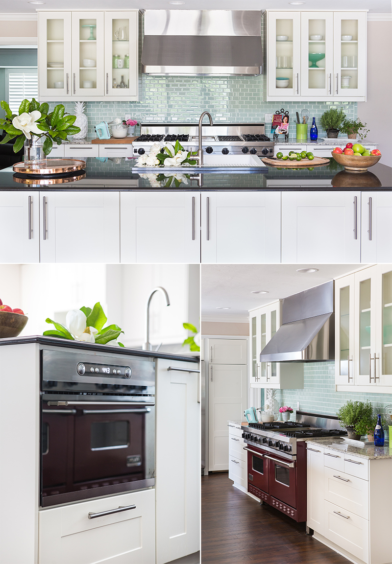 Color uniformity between the white cabinets, subway tile backsplash and marble countertops gives height to the room. A mix of glass and solid doors give covered storage for some items, and a chance to display others, like Leah’s MacKenzie-Childs dinner and serving ware.