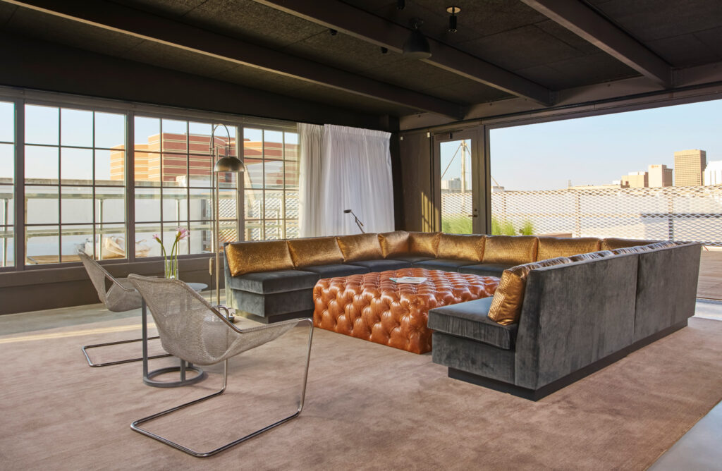 The indoor/outdoor space on the rooftop level is versatile, with views of downtown. Photo by Sara Stewart.