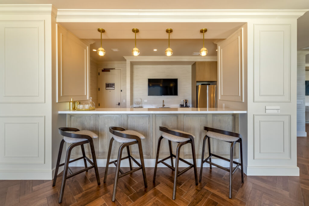 For morning coffee and evening drinks, the bar and kitchen area is designed with wood paneling.