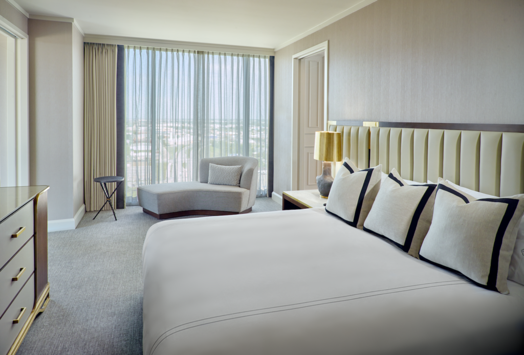 The Presidential King Suite is furnished in golden tones and soft textures throughout. Plush carpet, sofas and pillows invite you to nestle in. An adjoining room can be added for extra overnight accommodations to make it a two-bedroom suite. A spacious kitchen and bar take up the corner of the room, next to a round dining table offset by glamorous pendant lighting. The hotel’s location beside the Myriad Botanical Gardens provides excellent views that change every season. Guests can admire the gardens from both the 12th-floor suite and Flint’s patio downstairs. Simply cross the street for a scenic stroll through the park.