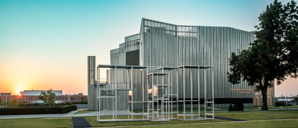 As you drive down Broadway Avenue through Oklahoma City’s historic Automobile Alley District, you can’t help but to notice the striking 54,000 square foot Oklahoma Contemporary building. The sleek, silver, modern exterior was purposefully shaped and intricately crafted out of aluminum folds, standing out in a rich contrast against historic architecture lining the rest of the Avenue. Architect Rand Elliott crafted this design, inspired by the rich array of colors one may experience when gazing upon our Oklahoma sky. The structure was created to hold light, transforming its reflection throughout the day and among our changing seasons. Sometimes it towers as a deep blue or navy – depending on the time of day – other times it glows with yellows, oranges, pinks, and reds during Oklahoma sunrises and sunsets. The architect’s dream of this project titled “Folding Light” was to extend the message: “This is a place where people can be inspired and a place where they can be creative”, which is perfect for the building’s purpose as a world-class facility for art exhibitions, performances, and education. This building honors our state’s natural beauty and reflects it right back to us – hoping to inspire a little creativity in us all.