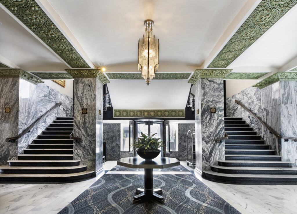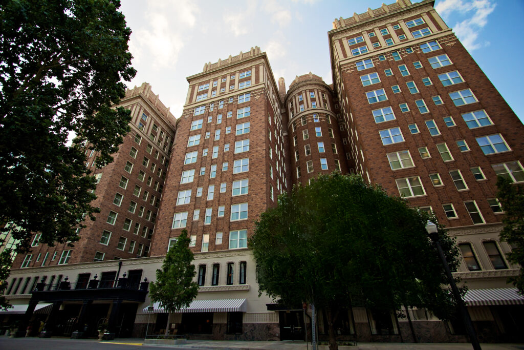 Named after founder William Basler “Bill” Skirvin, the Art Deco architecturally styled Skirvin Hilton Hotel is the city’s oldest hotel with three wings, 14 stories, 225 guest rooms, 18,500 square feet of flexible event space, three ballrooms and several event rooms. It has experienced ups and downs, visits from entertainers and presidents, ownership changes, oil busts and bank closures which forced the hotel to shutter its doors for 19 years. It reopened in 2007 as the Skirvin Hilton Hotel, refreshed but with many historic features intact, including the lobby’s wood paneled column carved gargoyles of the hotel’s architect and the state’s first governor Alfalfa Bill Murray, the painted plaster ceilings in the top floor ballrooms. Its historic character is evident in the 29 hand-carved Bacchus busts accented with gold leaf, the arched wooden entry ways in the lobby and the decorative lobby elevator doors. Current renovation plans will embrace the historic and art deco details with a nod to a more grandiose space as would have been seen through the eyes and style of Skirvin’s daughter Perle Mesta, known as the hostess with the mostess.
