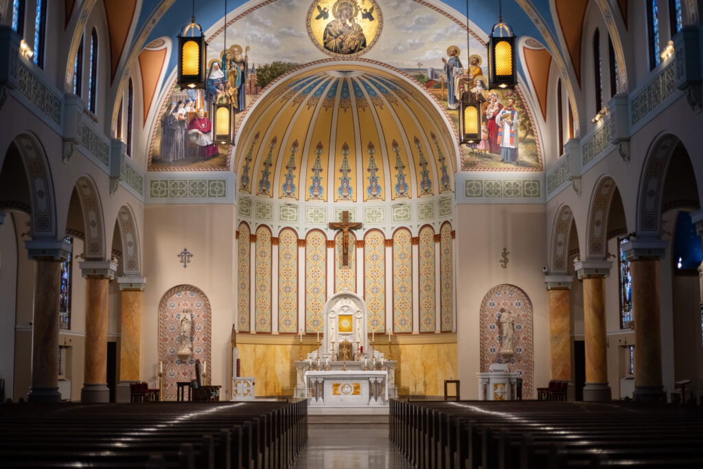 It’s difficult to believe this breathtaking Romanesque structure developed from such humble beginnings. Originally established as a parish church in 1919, the mission operated out of a small wooden building constructed by 12 dedicated volunteers of the congregation. Eventually it was elevated to the Cathedral we know and love today with its first brick laid in 1923. However, in 2015, a major renovation project became necessary to restore the Cathedral to its original glory. This project included the creation of a mural that represents the history of the Oklahoma City Diocese and its community. One side of the mural showcases Oklahoma City landmarks like the survivor tree from the Oklahoma City bombing and the Vietnamese Martyr (depicting characteristics of the Cathedral’s diverse congregation, which expanded in the 1970’s as many Vietnamese families sought comfort from religious persecution in their native country by migrating to America). The project also saw the collaboration with Rambusch Decorating Company, who designed new lighting and furnishings and restored the high altar from a decommissioned church. Thanks to the unwavering support of its devoted parish family, the Cathedral continues to thrive, standing as a testament to the faith, community, and diversity of Oklahoma City.