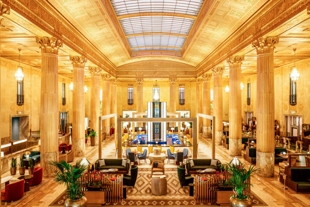 Built during the height of The Great Depression, The First National art deco-style building stands at 406 feet tall with 33 floors (and to 446 feet at its spire) as a symbol of our city’s past and present resilience. The structure’s original square footage in the 1930’s began at 451K. However, additions in 1957 and 1972 brought the square footage to 998K of office space. In 2017, local developers began renovations to set the property on a new path, housing 146 hotel rooms, 193 apartments, and a variety of newly beloved restaurants and retail spaces. This restoration project reduced square footage back down to 497,371 and – as of 2022 – the ‘57 and ‘72 additions to the building were repurposed into a parking garage. Unbeknownst to most locals, the premises connect to adjacent structures within the downtown area via the Oklahoma City Underground series of tunnels and elevated walkways. Neoclassical style inside and out, featuring polished aluminum, granite, glass and several varieties of marble from around the world makes this historical building breathtaking, and murals depicting Oklahoma’s history in the four corners of the banking lobby, painted by Chicago artist Edgar Spier Cameron, remind us of our rich heritage.