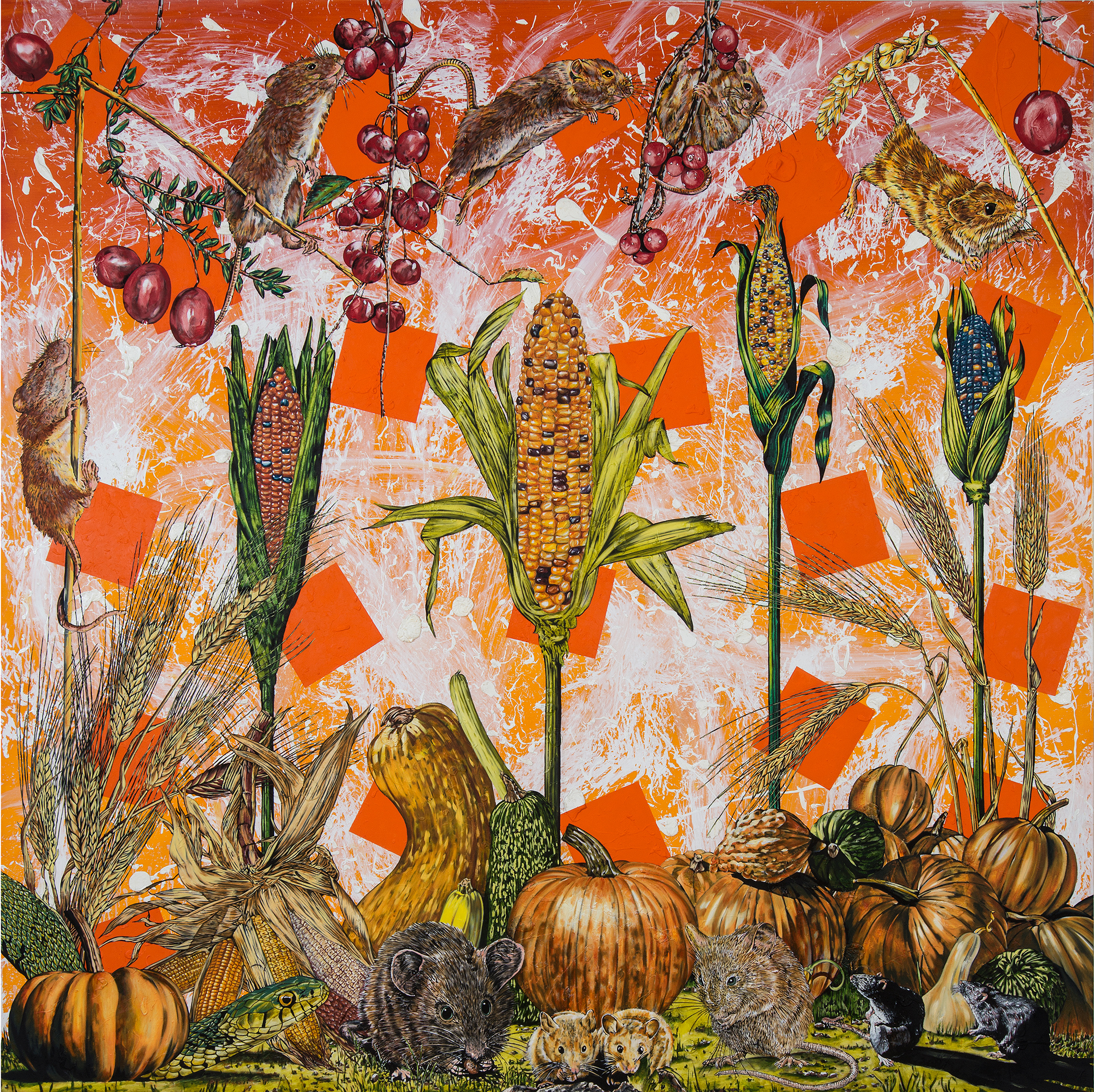 when asked how Oklahoma influenced his eventual aesthetic. “It is a space I can reference in my imagination or ‘image-nation,’ if you will. This not only appears in a pictorial image of a landscape, but also those creatures which inhabit it. ‘Homecoming’ and ‘Harvest’ (two pieces that will