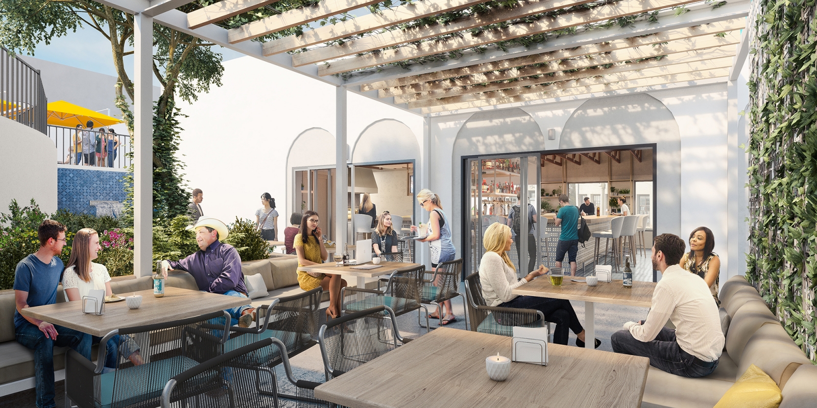 Designed by Architecture firm AHMM, the space – complete with a u-shaped bar that is the centerpiece of the interior – opens out to a patio with a partially covered trellis and water feature, described as “the perfect patio for such a concept,” by Fiaccone.