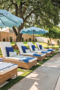 Lounge chairs with cushions and pillows in no-fade, weatherproof fabrics are a thoughtful way to accommodate those craving a little more Vitamin D. Organize a bar cart nearby with all the essentials — sunblock, towels and an icy bucket of bottled drinks — for extra convenience. Monogrammed towels provide a personal touch, and you can mix in a hammock or two if your backyard has the right trees.
