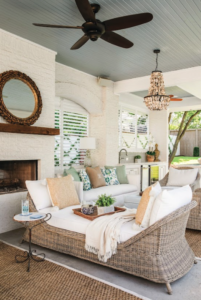 Durable outdoor furniture is only part of designing an outstanding exterior living room. Seek out nautical touches, like a chandelier dripping in seashells or a rattan chaise daybed in neutral tones. Lay down rugs to group seating vignettes together, and use potted plants for bursts of color and texture. To keep the area in play after summer concludes, install heaters, a fire pit or a fireplace. Cool plus cozy equals a year-round poolside paradise.
