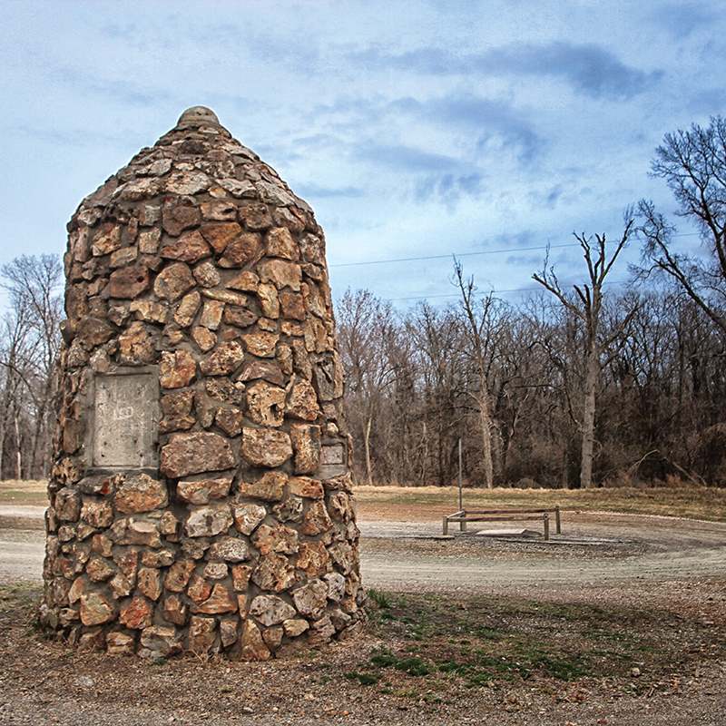 The sign recalled that the massive stone marker once housed brass plaques inscribed “Oklahoma 1907” on the south side, “Kansas 1861” on the north side and “Missouri 1821” on the east side. The earlier surveyors and the scope of their task were memorialized: “This point was established in 1857 by an 800-member expedition starting at the southwest corner of Missouri and working north. The party included soldiers, teamsters, cooks, astronomers and surveyors. The expedition took nearly six months, being hampered by rough terrain, heavy timber and high water.”