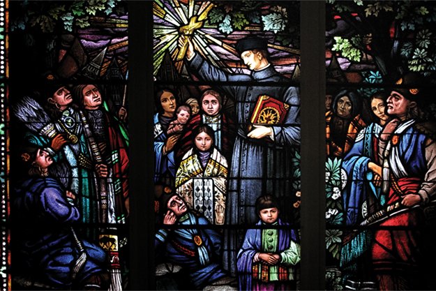 Towering at 36 feet, the window in Immaculate Conception Church memorializes the Jesuit priest John Schoenmakers. He lived and worked at the Osage Mission in Kansas for 36 years, from his arrival in 1847 until his death, bringing Catholicism, enthusiasm and supplies. Unlike previous missionaries, he encouraged the tribal members to adopt a blend of Christianity and traditional Osage culture. They coined the term “shouminka,” an affectionate version of his name, as the new Osage word for priest.