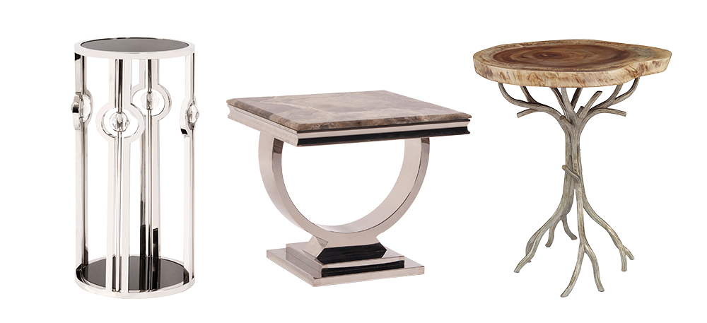 Stainless steel pedestal table with black tempered glass and acrylic ball details, $900 from Designer’s Market | Stone-topped side table with polished stainless steel base, $1,800 from Designer’s Market | Tree branch table with iron base in brass finish, supporting a top of petrified wood sliced from a natural tree trunk (no two are alike), $995 from The Wood Garden