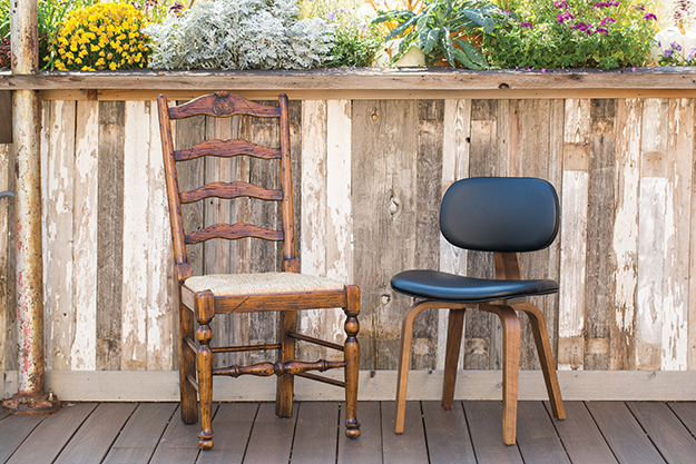 l to r: A country oak ladder back side chair from Mister Robert Fine Furniture & Design: the arched Spencer crest centered toprail above a rush seat and on turned legs joined by stretchers | Thompson chair from Urbane, OKC: in walnut with black leather