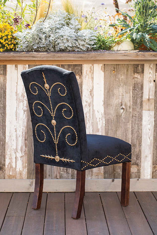 l to r: Hicks chair from Sara Kate Studios, OKC: a whimsical chair with traditional elements. Handmade in India with foil finish. | Stool from Plenty Mercantile, OKC: counter height and reclaimed wood top on hairpin legs. | Casual cross-back chair from Mister Robert Fine Furniture & Design, Norman: a weathered antiqued oak finish with an ecru linen seat.