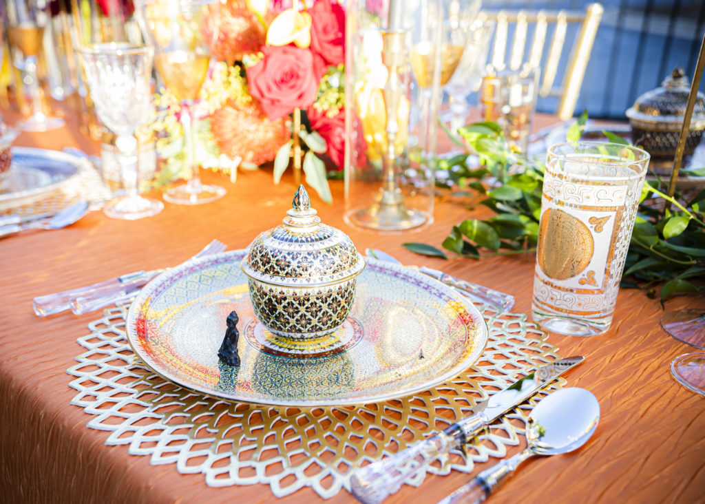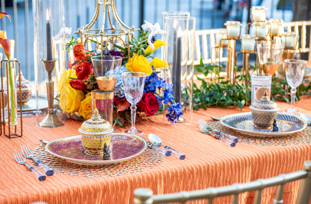 For this event, jewelry designer Erica Courtney celebrated her jewels and gems inspired by her love of Thailand. Valerie Naifeh and Calyn Jump imagined a wonderful Thai night celebrating Erica’s highly anticipated Trunk Show a few months earlier, and the planning began. On the patio at Naifeh Fine Jewelry, we set up a beautiful scene of bold colors and decor inspired by dreams of Bangkok. The guests were greeted by a grand dinner table awaiting them that left them in amazement of the cuisine, decor, flowers and the wonderful conversations.