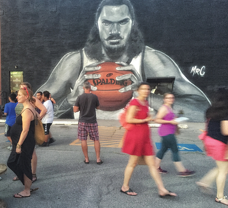 Three weeks before Durant made his decision, a massive mural quickly took shape on the side of the Paramount, a 90-year-old brick building on Film Row within sight of Chesapeake Arena. It was an impromptu work, created without permits or pay, by artist Graham Hoete in tribute to his favorite Thunder player. Steven Adams’ face, locked in an intense glower above his flexed arms and trademark tattoo, now soars three stories tall, dominating the view down Shartel for viewers facing east toward the sunrise. From the proper vantage point, the Devon Tower aligns on his head like a crown.