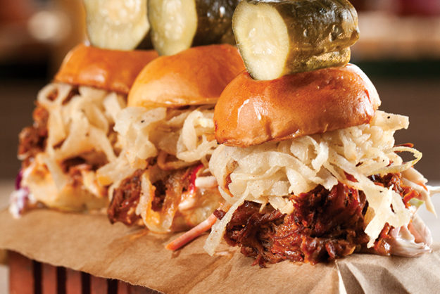 start with a bowl of the daily rotating soup (roasted corn gazpacho is a cool, tangy hit on a hot day) or the excellent Three Little Pigs, a trio of slider-sized buns overstuffed with savory pulled pork in a whiskey barbeque sauce, slaw and fried onion straws … all served on sticks with giant pickle chunks atop a huff- and puff-proof brick.