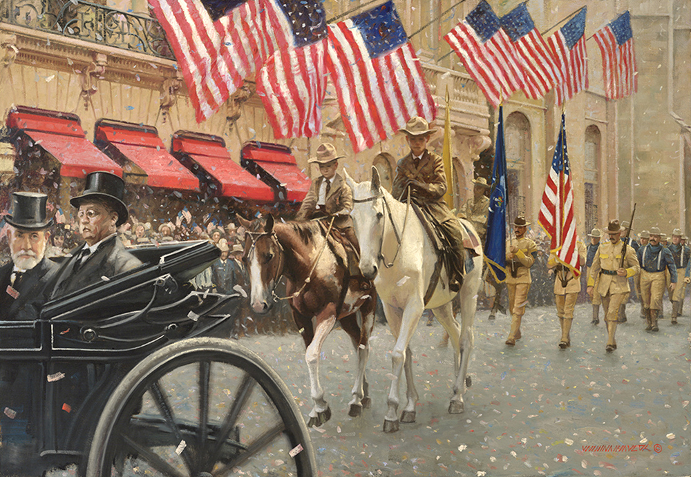 They made it in time for the ticker-tape parade, riding astride their horses – Sam Bass and Wylie Haynes – in a place of honor just behind Roosevelt’s carriage and in front of the reunited Rough Riders, who marched on foot through the Canyon of Heroes and up Broadway.