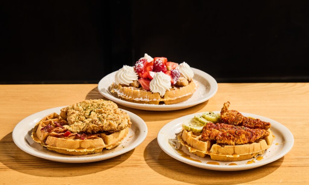 • Strawberry Shortcake Chicken & Waffles – Sweet meets savory with fresh strawberries, whipped cream, and powdered sugar on top of a Belgian waffle and fried chicken.