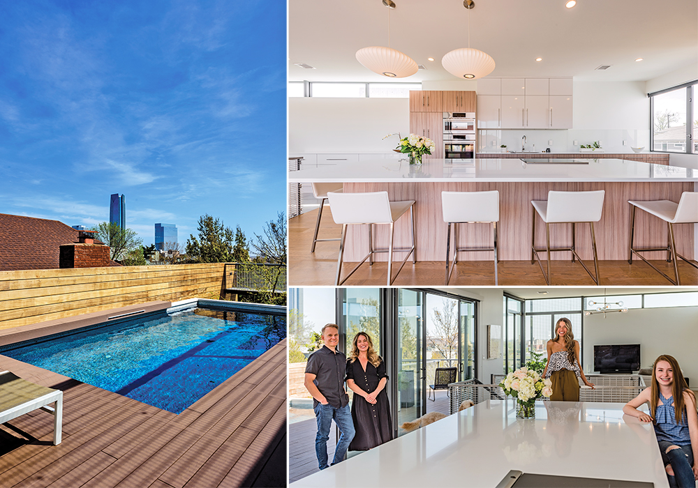 A rooftop saltwater pool beckons under a cerulean sky at the Cobb family’s home in the South of Saint Anthony district. In the not-too-distant background, downtown Oklahoma City makes its presence known, adding to the distinctly urban vibe of the neighborhood.