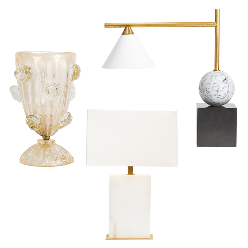 (clockwise from left) Antique Murano glass lamp, $3,250 from 30A Home in OKC // Cleo desk lamp with marble ball, $840 from 30A Home in OKC // White marble lamp, $720 from Cayman’s in Norman