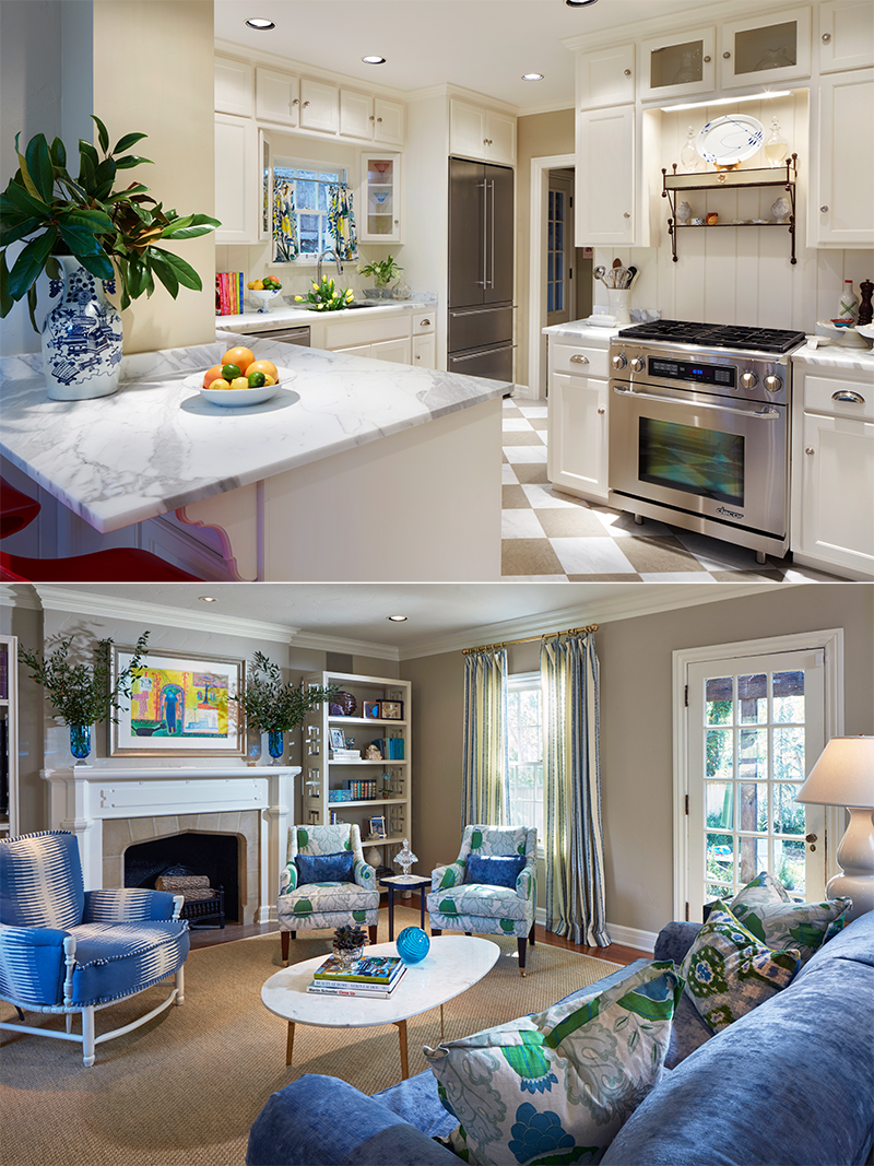 “I grew up with this couch in my parents’ home,” Katharine laughs. “It went with me to college; it’s been recovered four or five times. The blue and white chair in the living room came from my parents’ house; it’s been recovered multiple times, too.” Other chairs were sourced from a trip to South Carolina, where her sister lived for several years. Favorite items throughout the house were purchased while traveling (another hallmark of Katharine’s decorating style) and the art above the mantel is from an Arts Festival visit.
